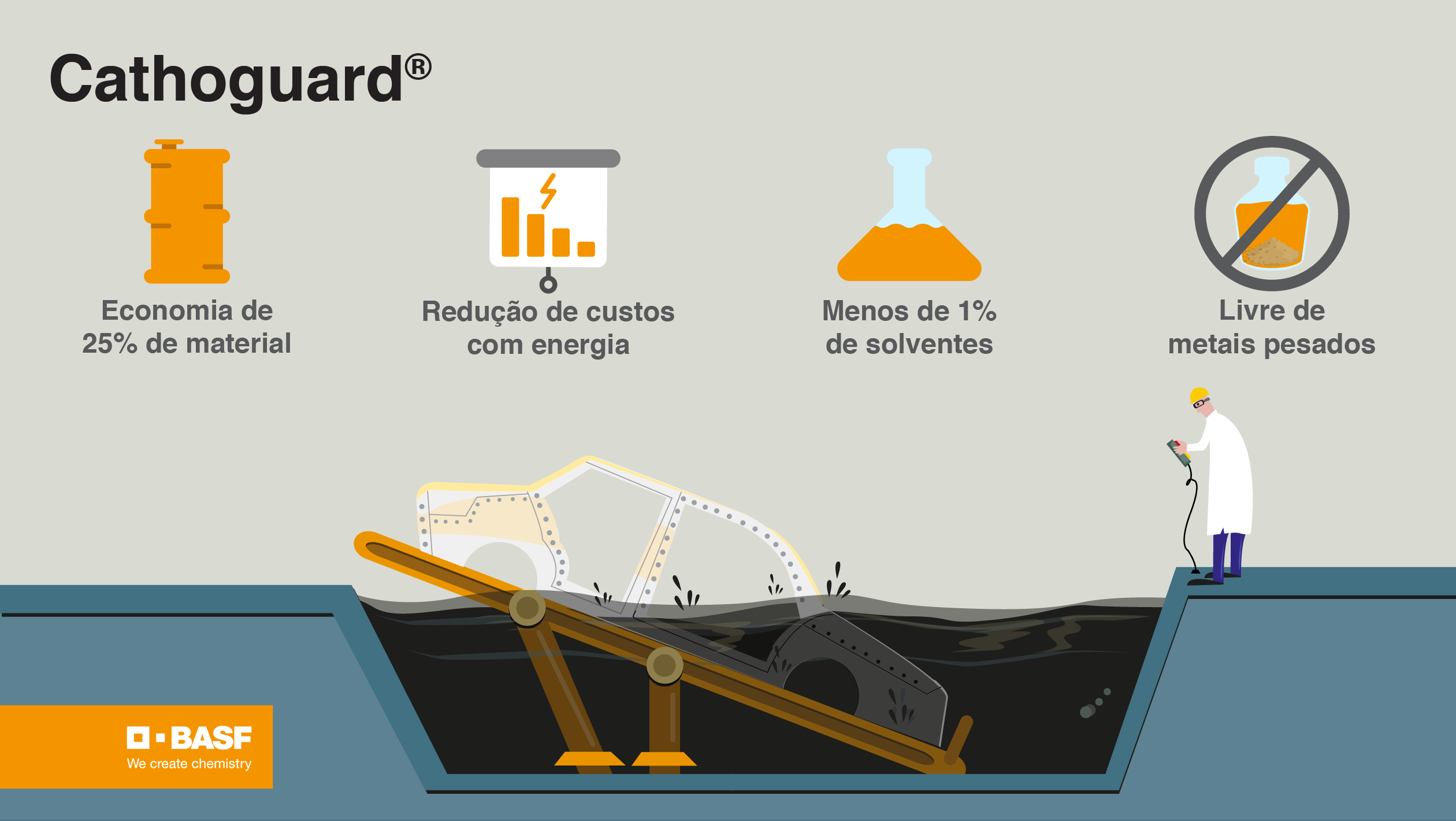 A indústria automotiva vem inovando seu modo de produção para oferecer veículos mais modernos e de forma sustentável. Entre as diversas soluções que a BASF oferece para colaborar com o desenvolvimento do setor, está o Cathoguard®, revestimento de e-coat para a proteção de alta qualidade contra a corrosão utilizado na cataforese, processo realizado antes da pintura das peças metálicas.