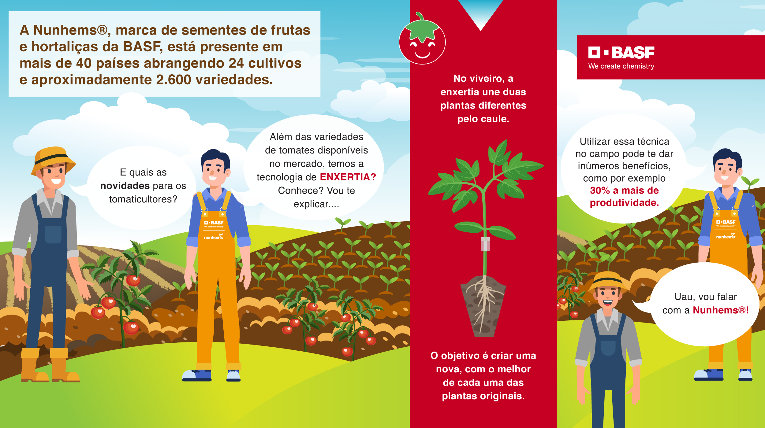 A Nunhems®, marca de sementes de frutas e hortaliças da BASF, está presente em mais de 40 países abrangendo 24 cultivos e aproximadamente 2.600 variedades. No setor tomateiro, a marca oferece diversas opções para serem cultivadas durante todo o ano, incluindo o híbrido ENPOWER, tecnologia de enxertia que está disponível também na Argentina, Chile, Equador e Colômbia na América do Sul, mas também em outras regiões como América do Norte, Europa, Ásia e Oriente Médio.