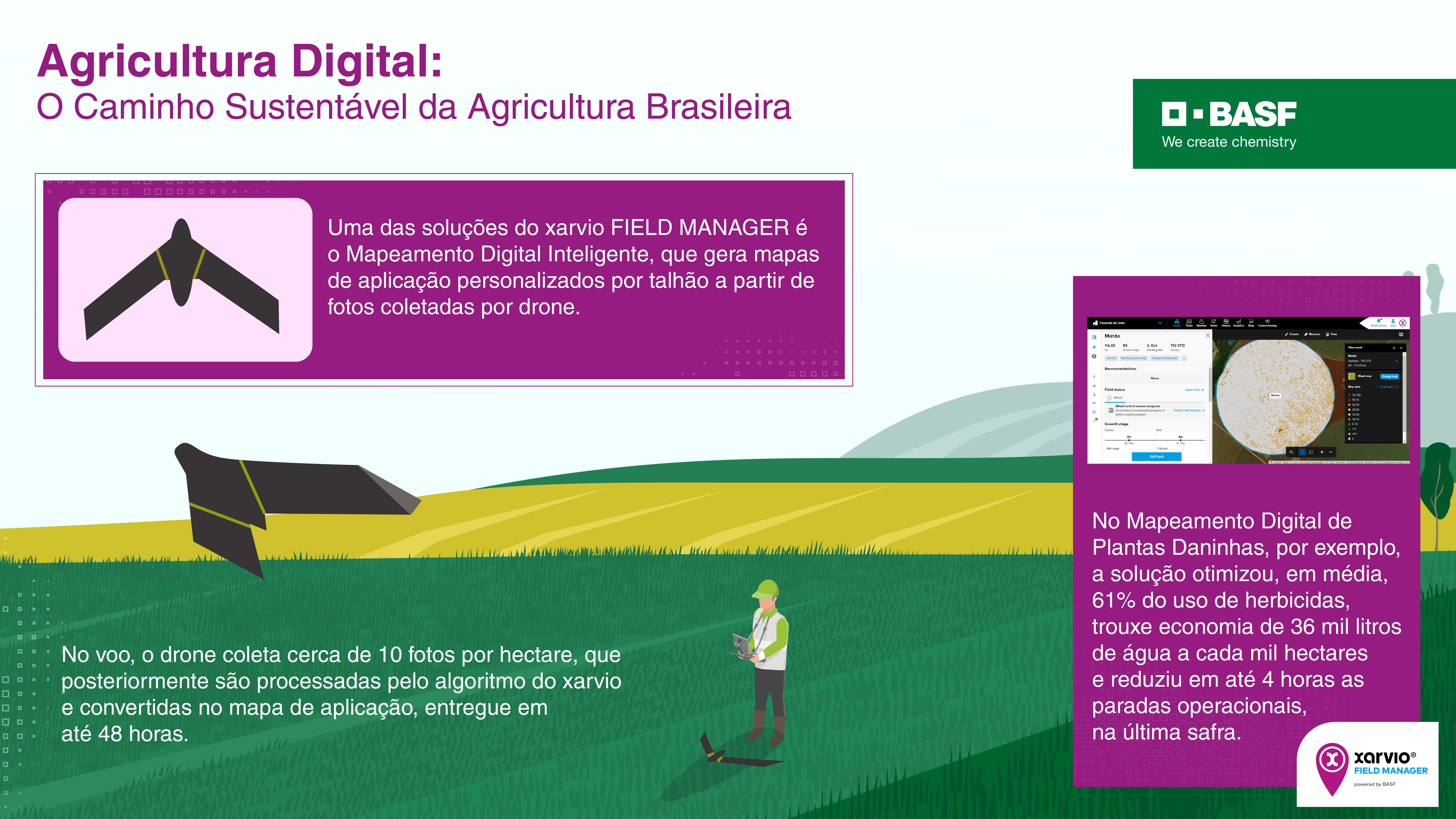 A tendência é clara: a agricultura digital é uma aliada poderosa na busca da sustentabilidade. O xarvio® Digital Farming Solutions está ajudando a pavimentar o caminho para um futuro agrícola mais sustentável no Brasil e no mundo. Isso está completamente alinhado com o Jeito E da BASF. Com essa tecnologia inovadora, podemos esperar uma produção mais eficiente E menor impacto ambiental E práticas agrícolas mais sustentáveis. Com a combinação de dados E tecnologia E conhecimento agrícola, o agronegócio caminha para uma agricultura mais eficiente E responsável, que atende às necessidades do presente E com boas perspectivas para o futuro.