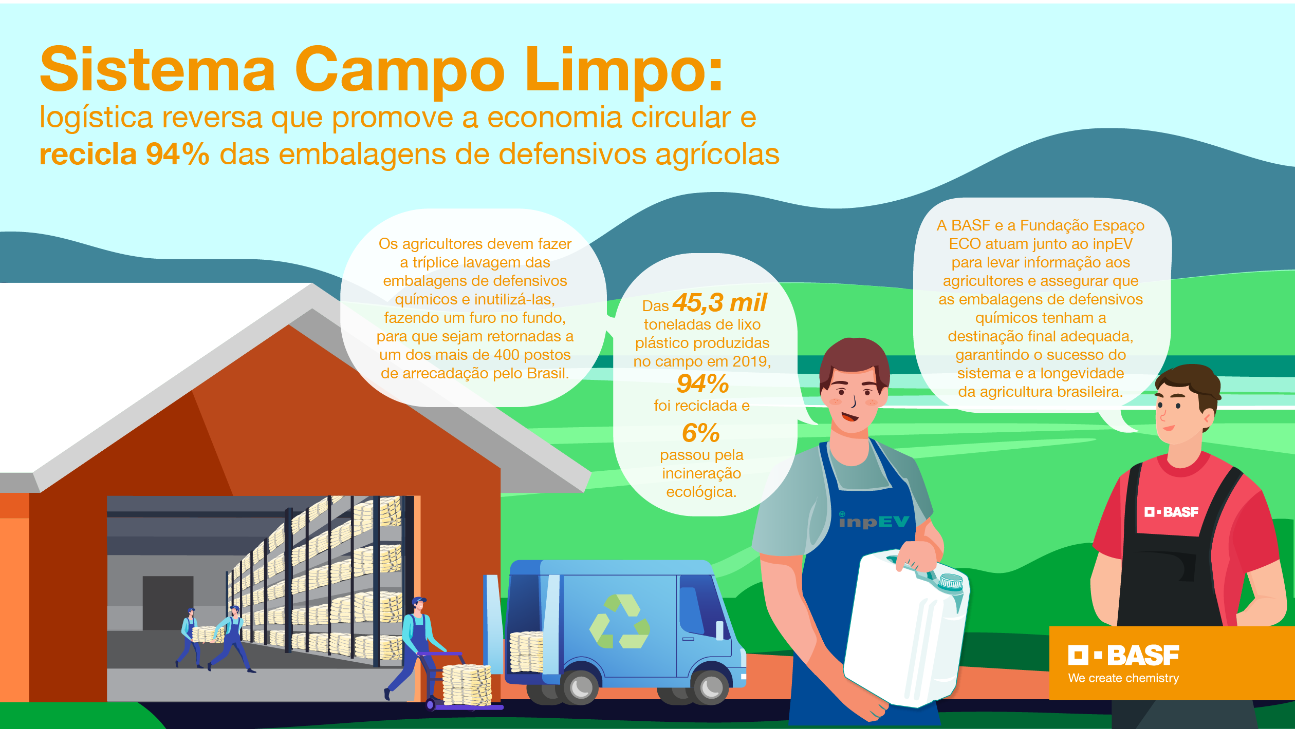 O Sistema Campo Limpo é mais uma iniciativa que reforça o Jeito E da BASF, criando química para um futuro sustentável. O programa mostra que é possível cuidar da lavoura E do meio ambiente; consumir E reciclar; produzir E reaproveitar. Mais de 1,8 milhões de propriedades rurais foram atendidas pelo sistema E 94% das embalagens de defensivos agrícolas foram reaproveitadas.
