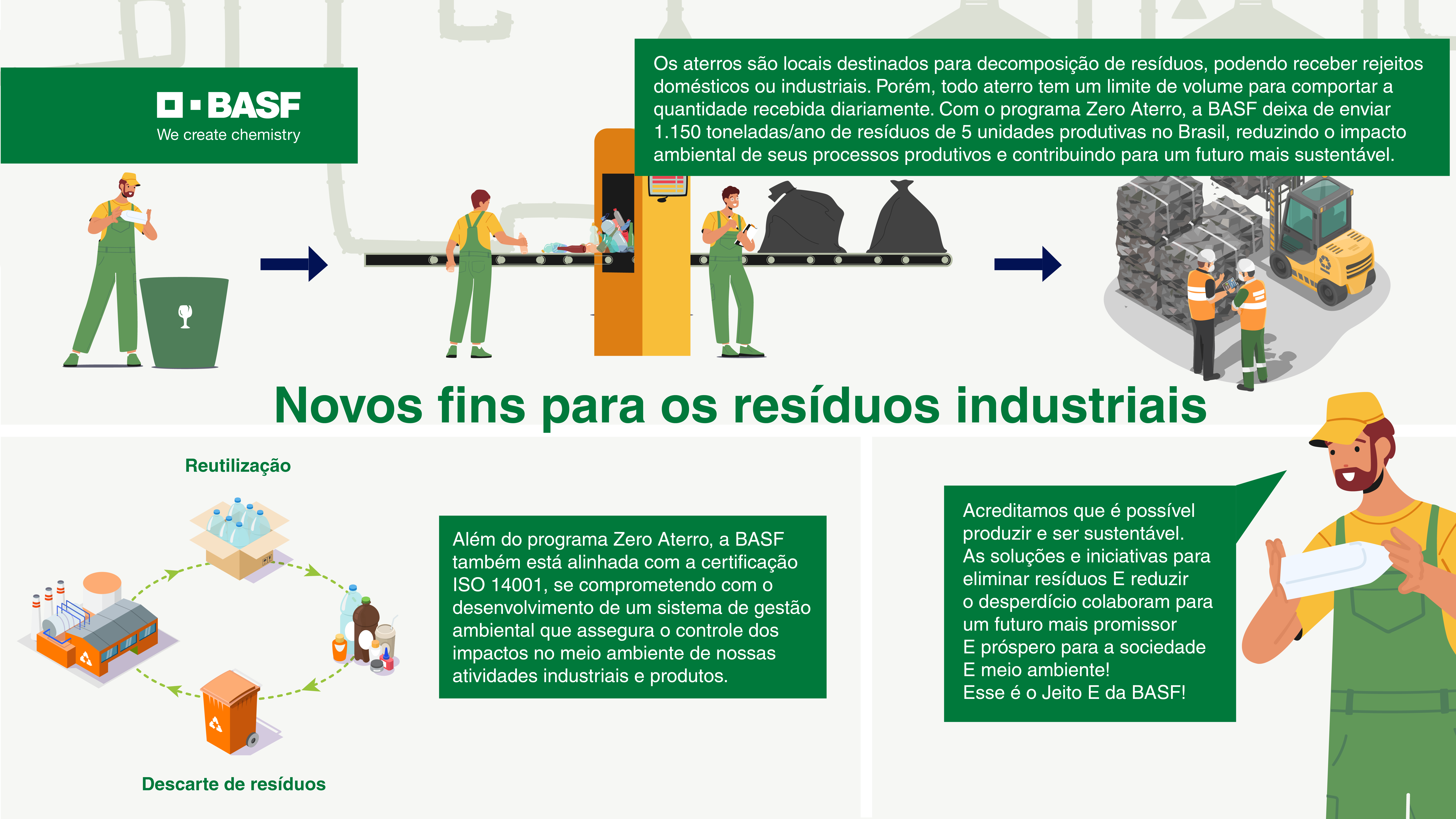 Alguns desafios sempre aparecem no dia a dia das operações. Mas, na BASF, sabemos que podemos uni-los às oportunidades. Esse é o Jeito E. O Zero Aterro é uma forma que encontramos de mantermos nossa produção E promover com um ecossistema mais saudável; de abraçar as oportunidades econômicas E levar bem-estar social E benefícios ao meio ambiente, principalmente para as localidades onde atuamos; se adequa às suas metas de sustentabilidade E busca por soluções inovadoras E criativas para transformar seus resíduos em recursos valiosos.