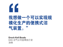 这个想法是 Boadu 在担任高中科学和技术教师时产生的。他回忆道:“我曾经和我的学生做了很多实验,我们开始在小容器中制造沼气。这让我意识到这项技术有很大的潜力。”Boadu 的实验一直持续到现在,他说,“我们在追求不同的方法,但我真的想做一个便携式装置,实现大规模生产,并安装在加纳以及其他国家。”