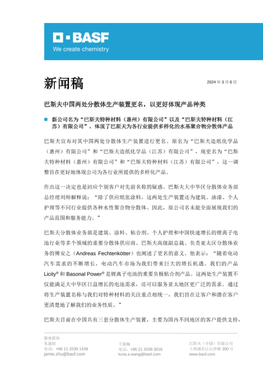 - 新公司名为“巴斯夫特种材料(惠州)有限公司”以及“巴斯夫特种材料(江苏)有限公司”,体现了巴斯夫为各行业提供多样化的水基聚合物分散体产品