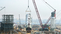 800吨蒸馏塔的运输技术要求极高,引起了中央电视台的关注,进行了90分钟的直播报道。引人注目的还有另一个高92米的蒸馏塔的吊装到位,需要动用特种吊车才能完成该操作。巴(照片:巴斯夫)