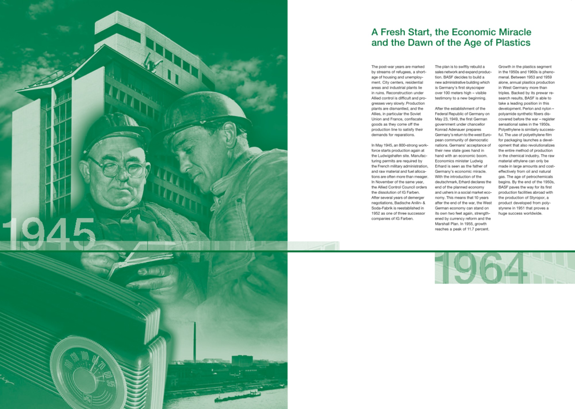 在经历了法国军事占领和关于法本公司的多年解体协商后,1952 年 1 月 30 日 Badische Anilin- & Soda-Fabrik 正式成立。尽管只剩下路德维希港基地的主要工厂和传统产品线,但巴斯夫依然抓住了 50 年代的经济繁荣机遇。