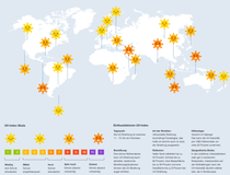 Mit Klick auf den jeweiligen Ort in der Weltkarte sehen Sie die typischen UVI-Werte im Laufe eines Jahres (Maximalwerte, das heißt um die Mittagszeit, jeweils am 21. eines Monats).