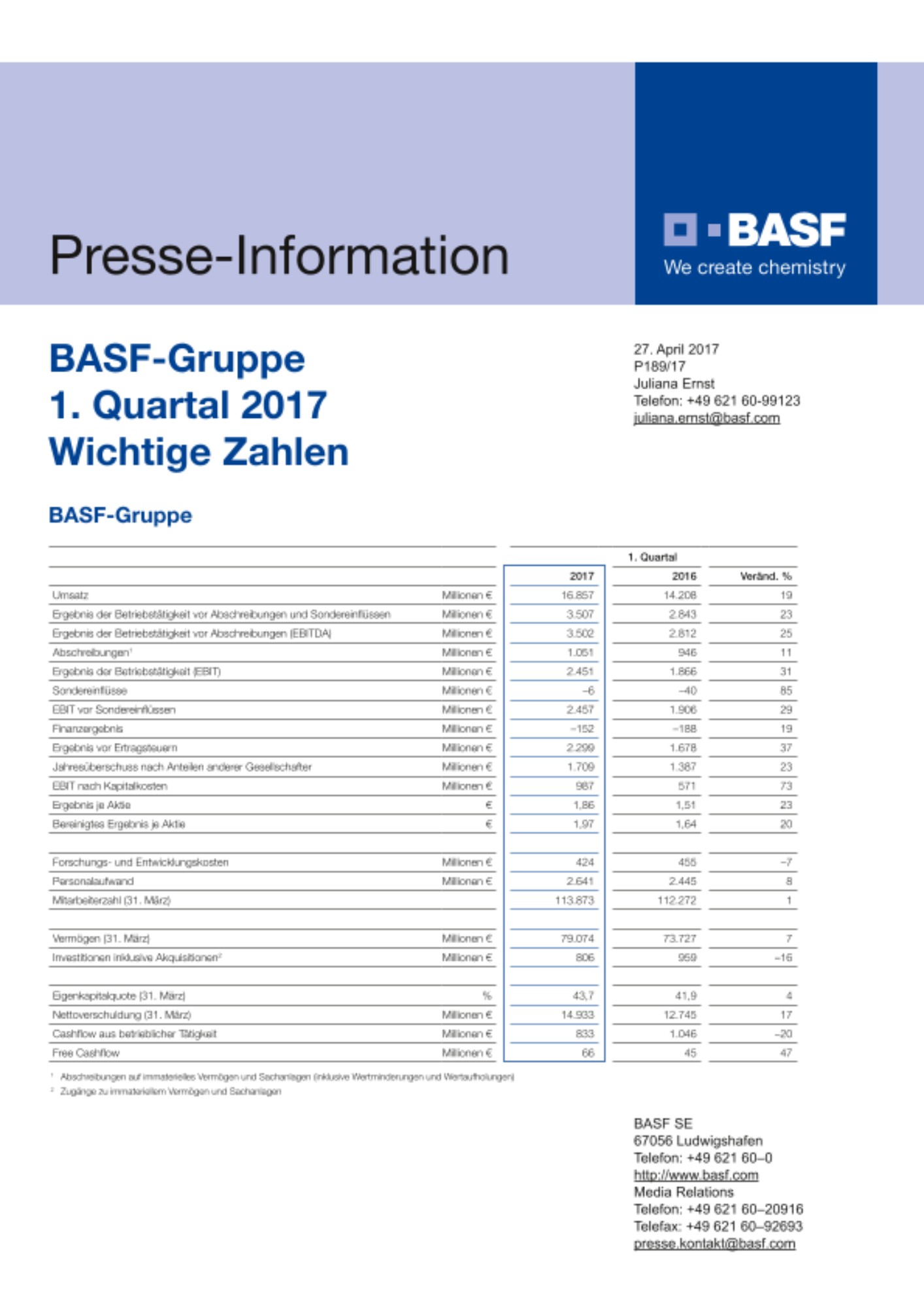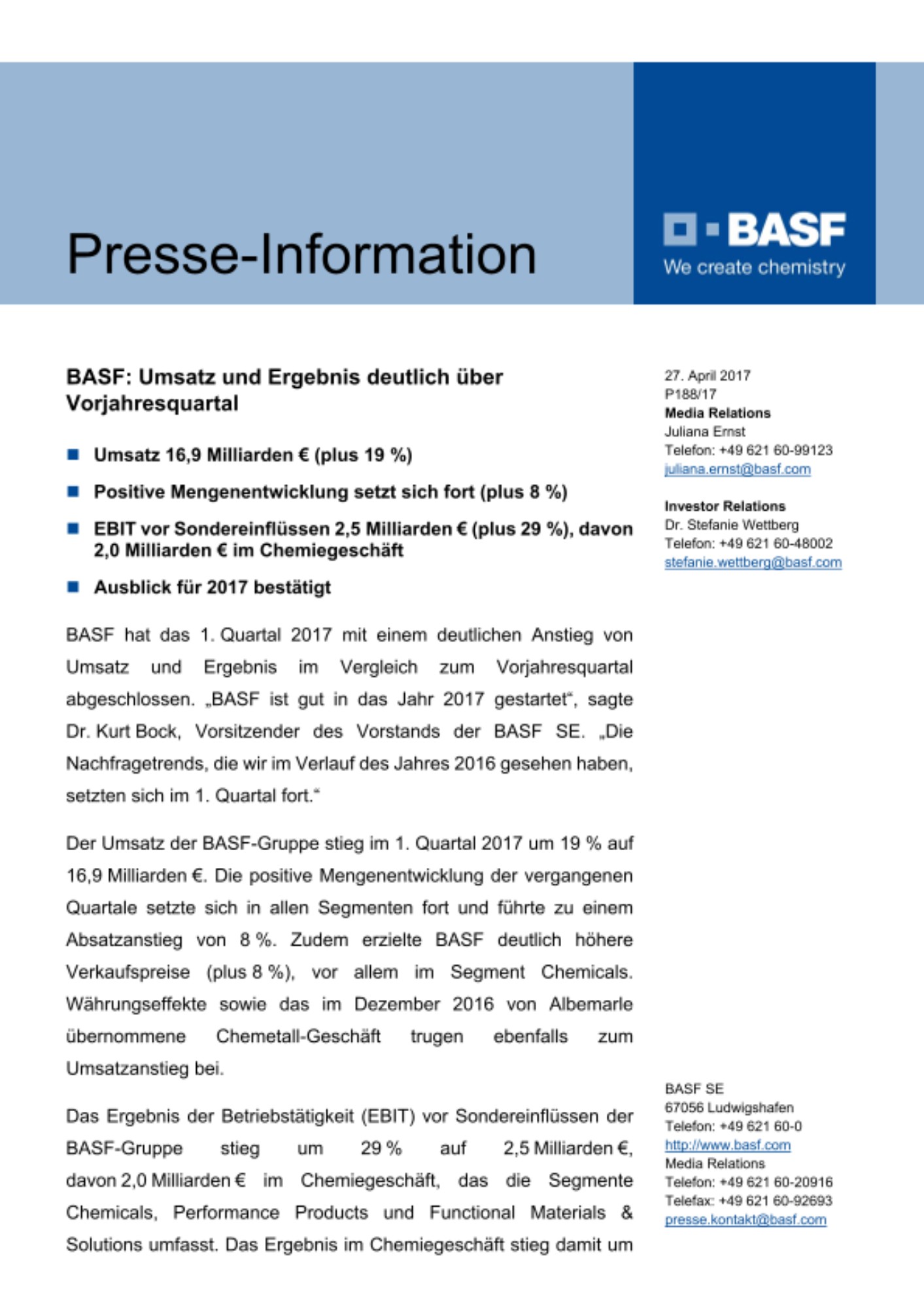 Der Umsatz der BASF-Gruppe stieg im 1. Quartal 2017 um 19 % auf 16,9 Milliarden €. Die positive Mengenentwicklung der vergangenen Quartale setzte sich in allen Segmenten fort und führte zu einem Absatzanstieg von 8 %. Zudem erzielte BASF deutlich höhere Verkaufspreise (plus 8 %), vor allem im Segment Chemicals. Währungseffekte sowie das im Dezember 2016 von Albemarle übernommene Chemetall-Geschäft trugen ebenfalls zum Umsatzanstieg bei.