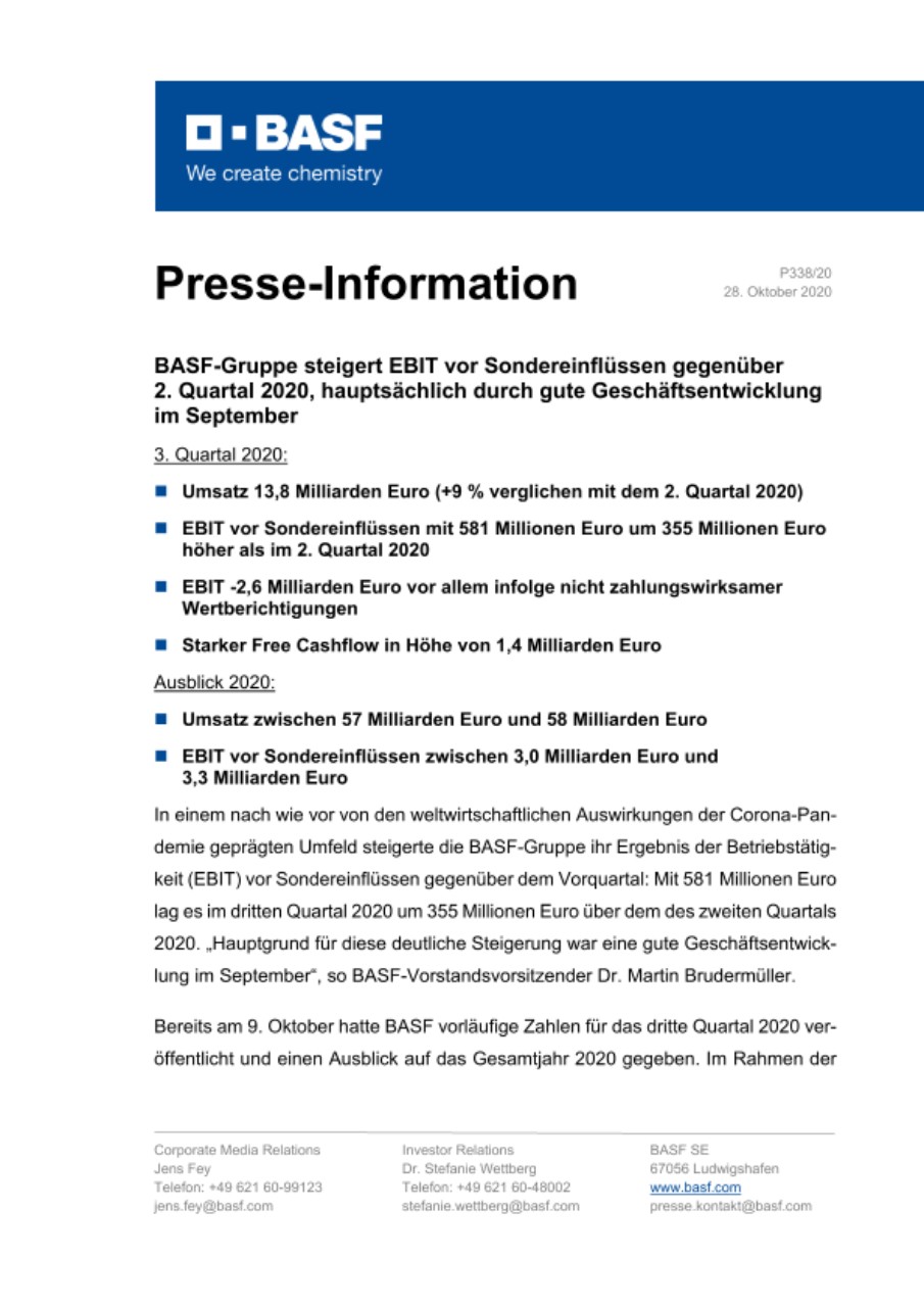 Bereits am 9. Oktober hatte BASF vorläufige Zahlen für das dritte Quartal 2020 veröffentlicht und einen Ausblick auf das Gesamtjahr 2020 gegeben. Im Rahmen der Veröffentlichung der Quartalsmitteilung zum dritten Quartal 2020 informierte Brudermüller gemeinsam mit Finanzvorstand Dr. Hans-Ulrich Engel über weitere Details.