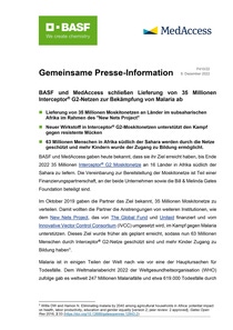 BASF und MedAccess gaben heute bekannt, dass sie ihr Ziel erreicht haben, bis Ende 2022 35 Millionen Interceptor® G2 Moskitonetze an 16 Länder in Afrika südlich der Sahara zu liefern. Die Vereinbarung zur Bereitstellung der Moskitonetze ist Teil einer Finanzierungspartnerschaft, an der beide Unternehmen sowie die Bill & Melinda Gates Foundation beteiligt sind.