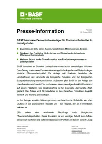BASF investiert am Standort Ludwigshafen einen hohen zweistelligen Millionen-Euro-Betrag in eine neue Fermentationsanlage für biologische und Biotechnologie-basierte Pflanzenschutzmittel. Die Anlage soll Produkte herstellen, die Landwirtinnen und Landwirte als biologische Fungizide und zur biologischen Saatgutbehandlung einsetzen können. Außerdem plant BASF in der Anlage den Hauptbaustein von Inscalis® zu produzieren, einem neuartigen Insektizid basierend auf einem Pilzstamm. Die Inbetriebnahme ist für die zweite Jahreshälfte 2025 geplant. Die Anlage wird 30 Mitarbeiter in den Bereichen Produktion, Logistik Technik und Wartung beschäftigen.