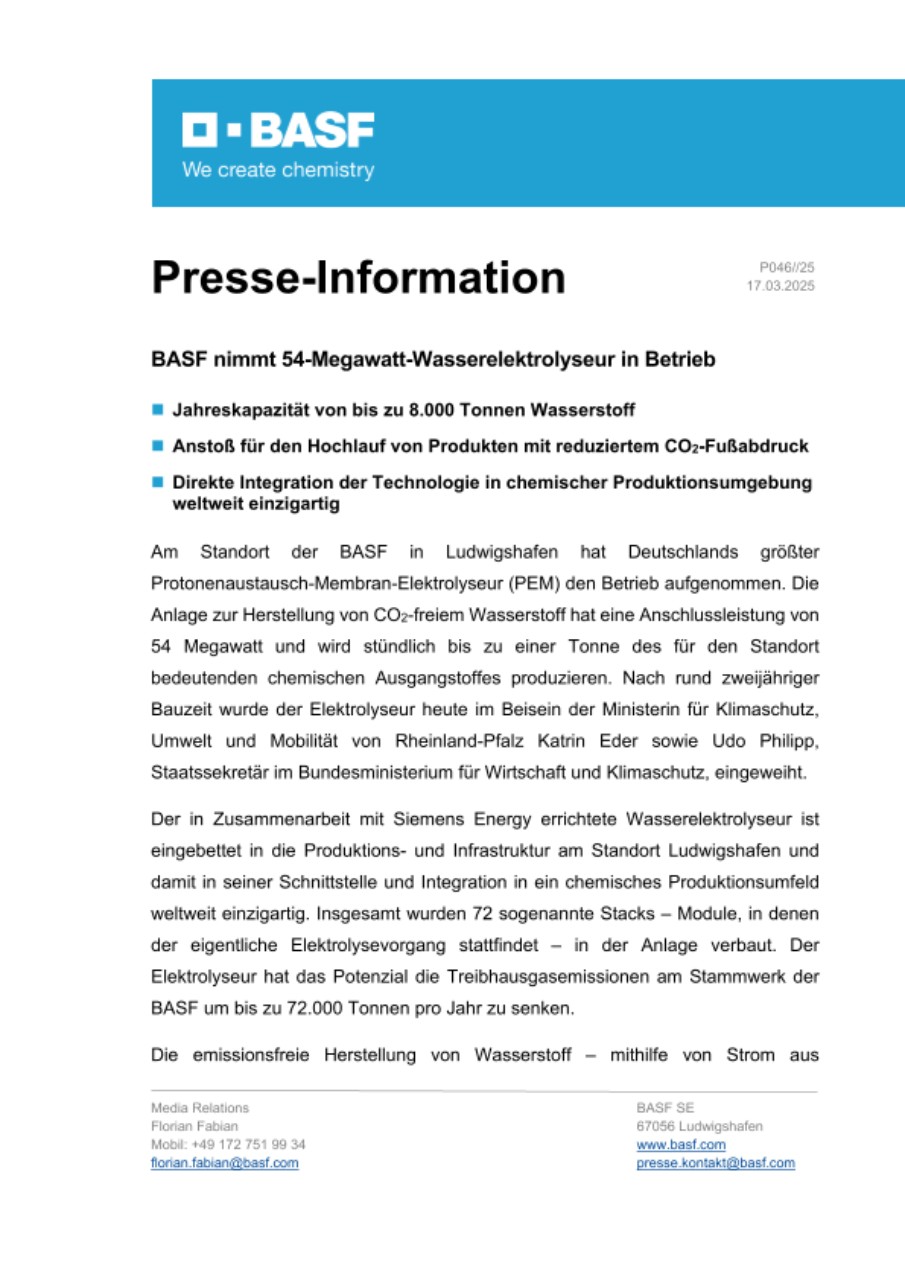Am Standort der BASF in Ludwigshafen hat Deutschlands größter Protonenaustausch-Membran-Elektrolyseur (PEM) den Betrieb aufgenommen. Die Anlage zur Herstellung von CO2-freiem Wasserstoff hat eine Anschlussleistung von 54 Megawatt und wird stündlich bis zu einer Tonne des für den Standort bedeutenden chemischen Ausgangstoffes produzieren. Nach rund zweijähriger Bauzeit wurde der Elektrolyseur heute im Beisein der Ministerin für Klimaschutz, Umwelt und Mobilität von Rheinland-Pfalz Katrin Eder sowie Udo Philipp, Staatssekretär im Bundesministerium für Wirtschaft und Klimaschutz, eingeweiht.
