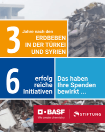Neben vielen lokalen Initiativen der Kolleg:innen in der Türkei spendete die BASF SE 500.000 Euro Nothilfe an das Deutsche Rote Kreuz und startete eine Mitarbeiterspendenaktion für mittelfristige Hilfsmaßnahmen. Hier kamen mehr als 844.000 Euro zusammen, die die BASF SE auf 2,1 Mio. Euro verdoppelte. Gemeinsam mit Vertreter*innen der BASF und lokalen Kolleg*innen setzte die BASF Stiftung die Mittel für ein Unterstützungspaket ein, das vor allem zwei Ziele hatte: