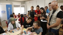 Etwa 1.000 Kinder besuchen die Schule täglich in Schichten. Mehr als 8.000 Menschen leben derzeit in dieser Containerstadt, aber es werden täglich mehr, weil sie aus Zelten umgesiedelt werden. © UNICEF/Kilic