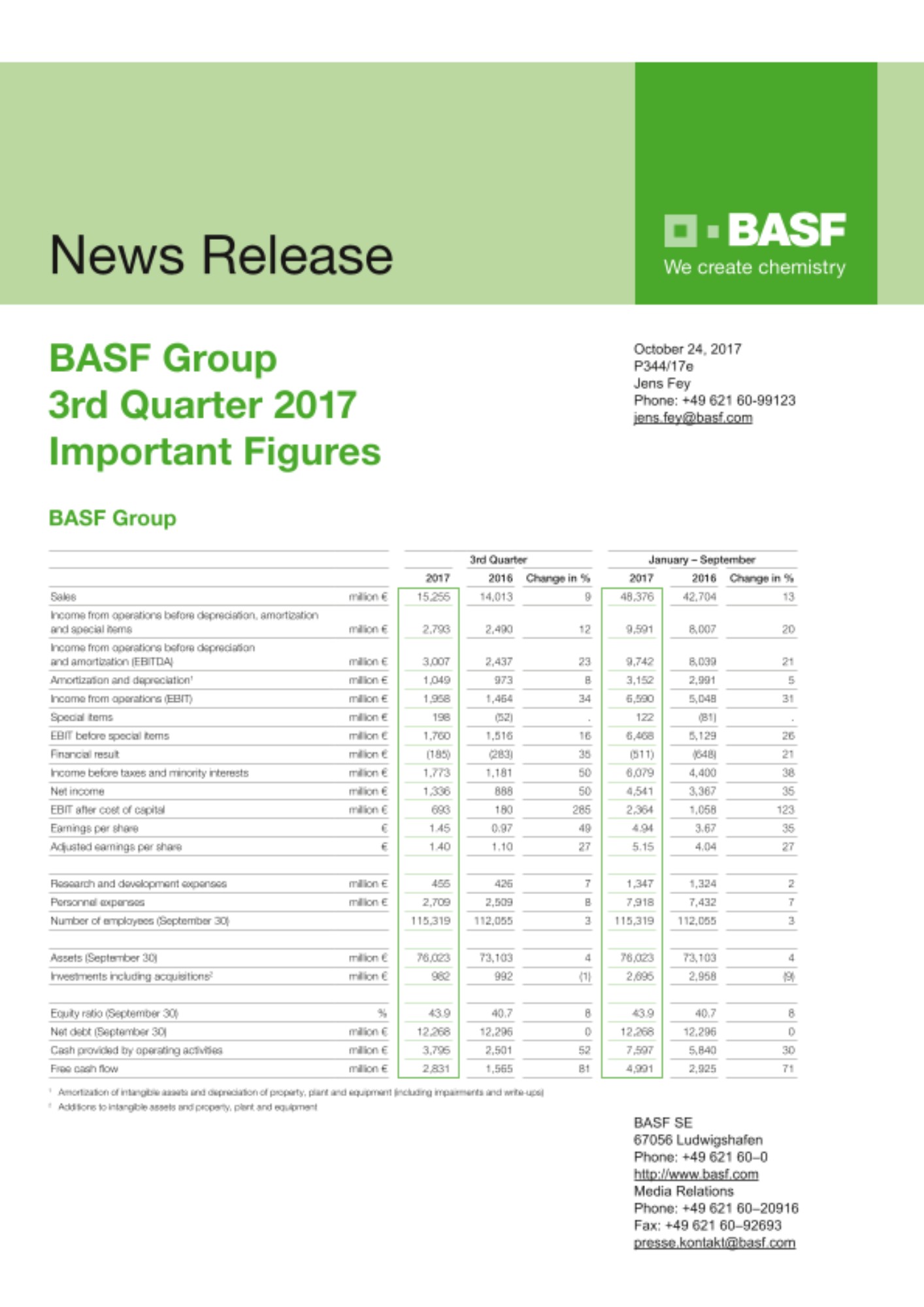 BASF Group recorded significant sales and earnings growth in the third quarter of 2017. “The positive demand development continued in the third quarter of 2017. We achieved solid volume growth, even compared with the strong prior-year quarter,” said Dr. Kurt Bock, Chairman of the Board of Executive Directors of BASF SE.