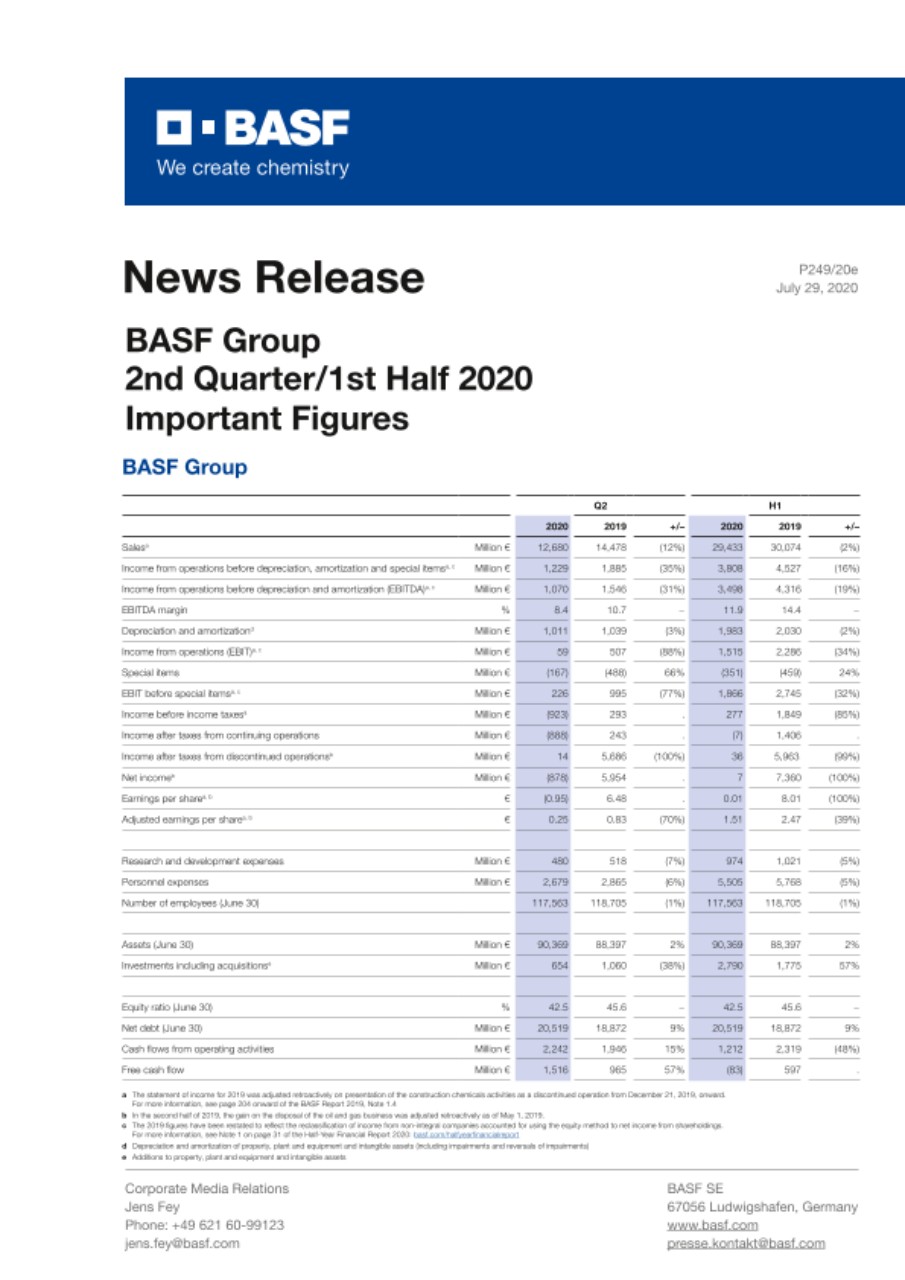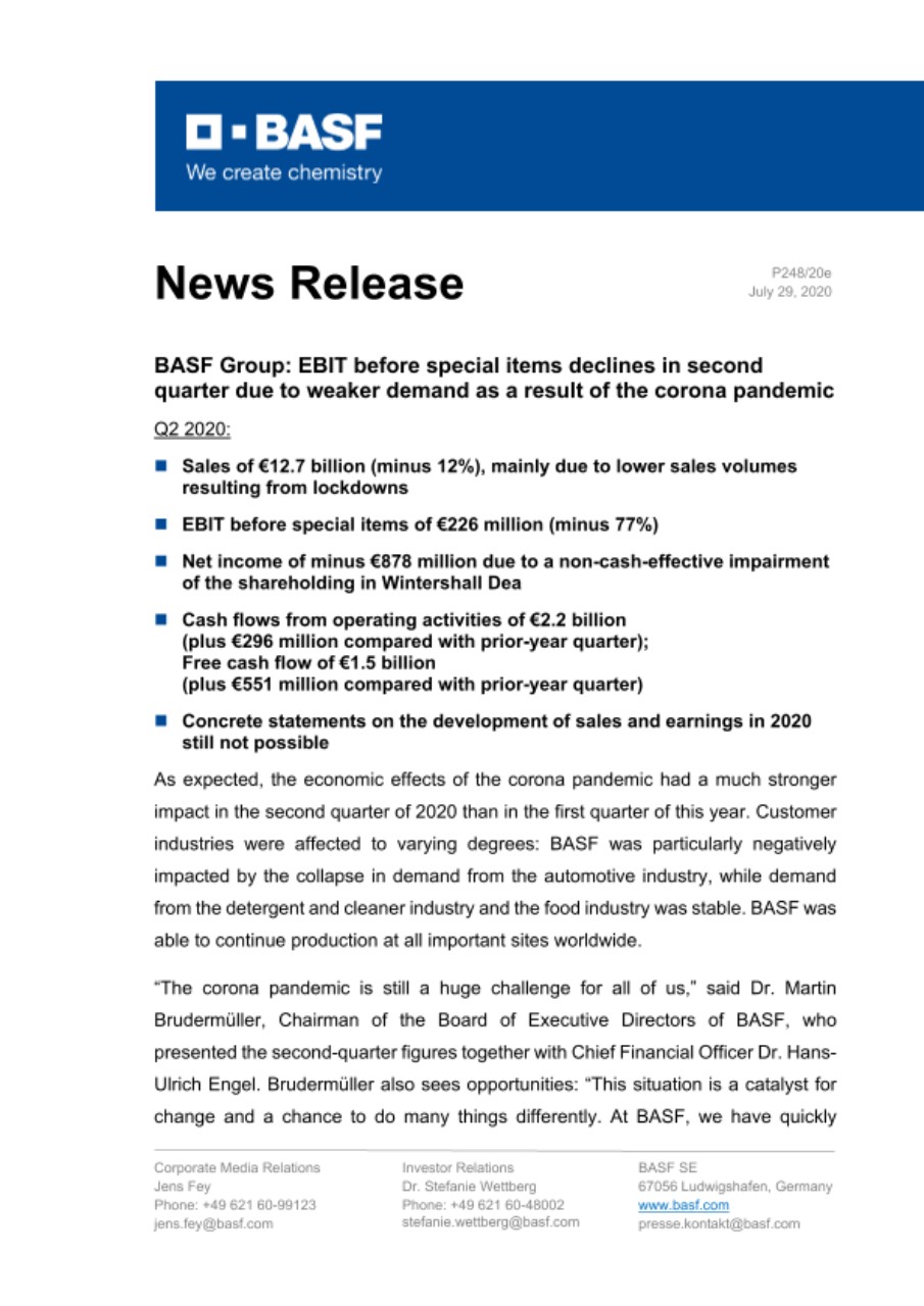 As expected, the economic effects of the corona pandemic had a much stronger impact in the second quarter of 2020 than in the first quarter of this year. Customer industries were affected to varying degrees: BASF was particularly negatively impacted by the collapse in demand from the automotive industry, while demand from the detergent and cleaner industry and the food industry was stable. BASF was able to continue production at all important sites worldwide.