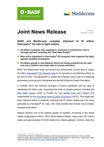 BASF and MedAccess today announced the achievement of their goal to supply 35 million Interceptor® G2 mosquito nets to 16 countries in sub-Saharan Africa by the end of 2022. The agreement to supply the mosquito nets is part of a financing partnership involving both companies and the Bill & Melinda Gates Foundation.