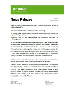 BASF invests a high double-digit million euro amount in a new fermentation plant for biological and biotechnology-based crop protection products at its Ludwigshafen site. The plant will manufacture products that bring value to farmers including biological fungicides and biological seed treatment. BASF also plans to utilize the plant to produce the main building block of Inscalis®, a novel insecticide derived from a fungal strain. Commissioning is planned for the second half of 2025. The plant will employ 30 people in production, logistics, engineering and maintenance.