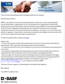 To request information as part of the Business Partner Due Diligence process, BASF Trust Base is sending emails to our partners. We understand that receiving communications from unknown senders can be concerning. Rest assured that emails you receive from BASF Trust Base under business-partner-due-diligence@basf.com are legitimate and secure. In case of doubt, please reach out to your BASF contact.