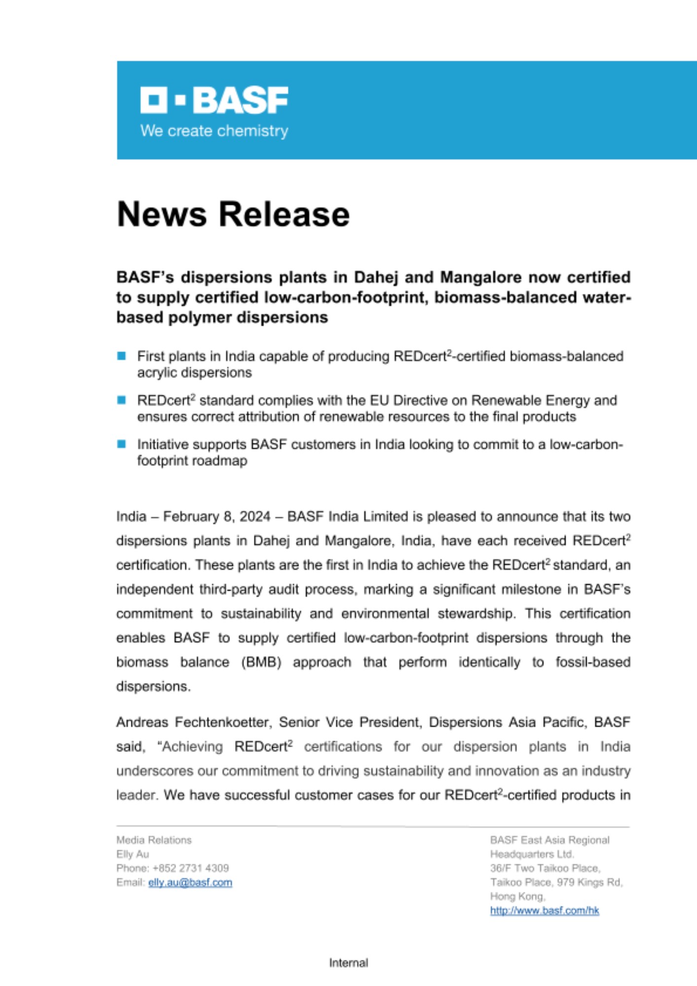 The two certified dispersion plants in India bring the number of BASF dispersion plants in the Asia Pacific region that have received REDcert2 certification to five. This accomplishment has further strengthened BASF’s ability to meet the growing demand for low-carbon-footprint solutions across various industries.