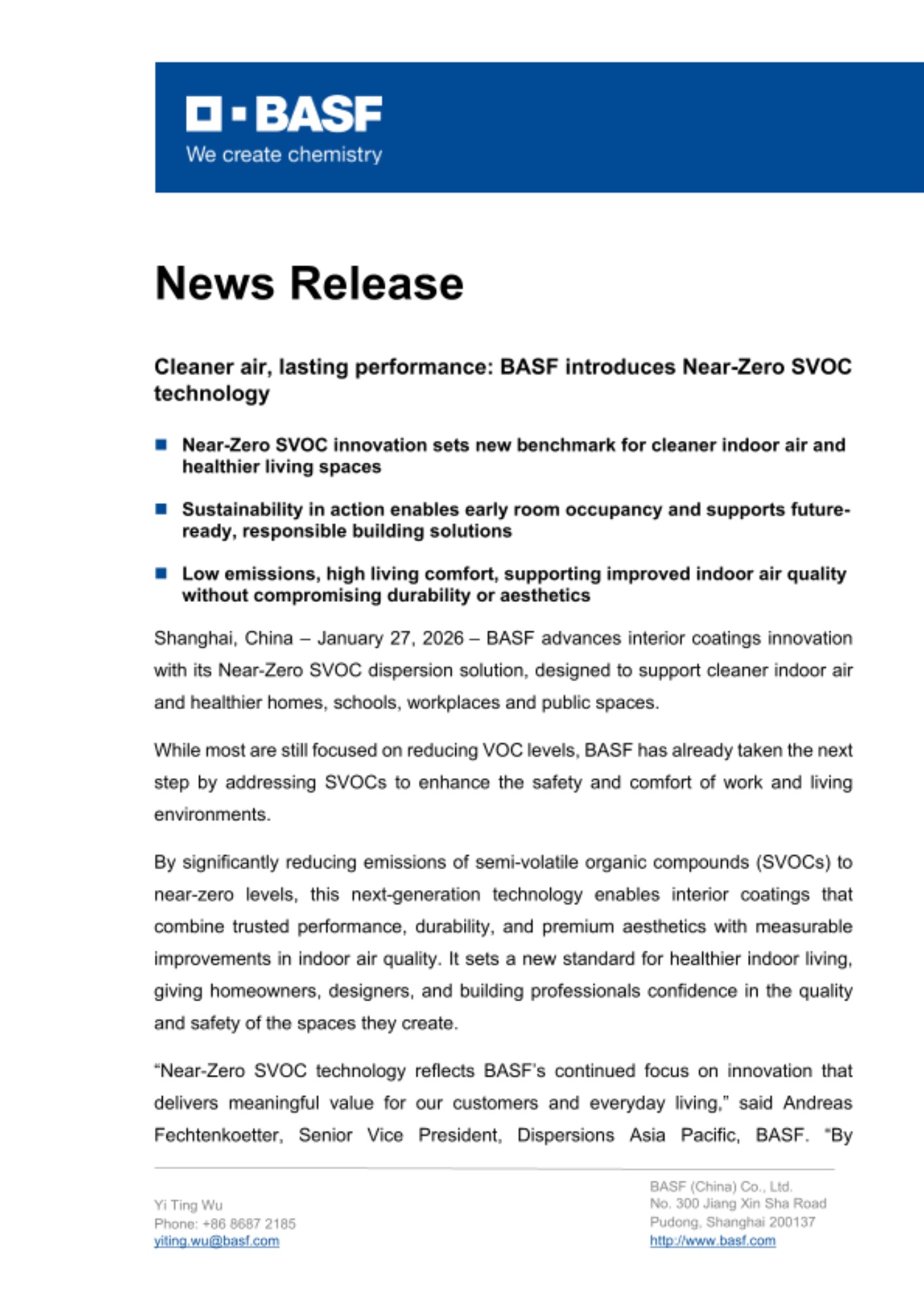 “Near-Zero SVOC technology reflects BASF’s continued focus on innovation that delivers meaningful value for our customers and everyday living,” said Andreas Fechtenkoetter, Senior Vice President, Dispersions Asia Pacific, BASF. “By significantly reducing emissions without compromising performance, we are pioneering innovation in interior coatings, creating healthier indoor environments while advancing more sustainable solutions for the built environment.”