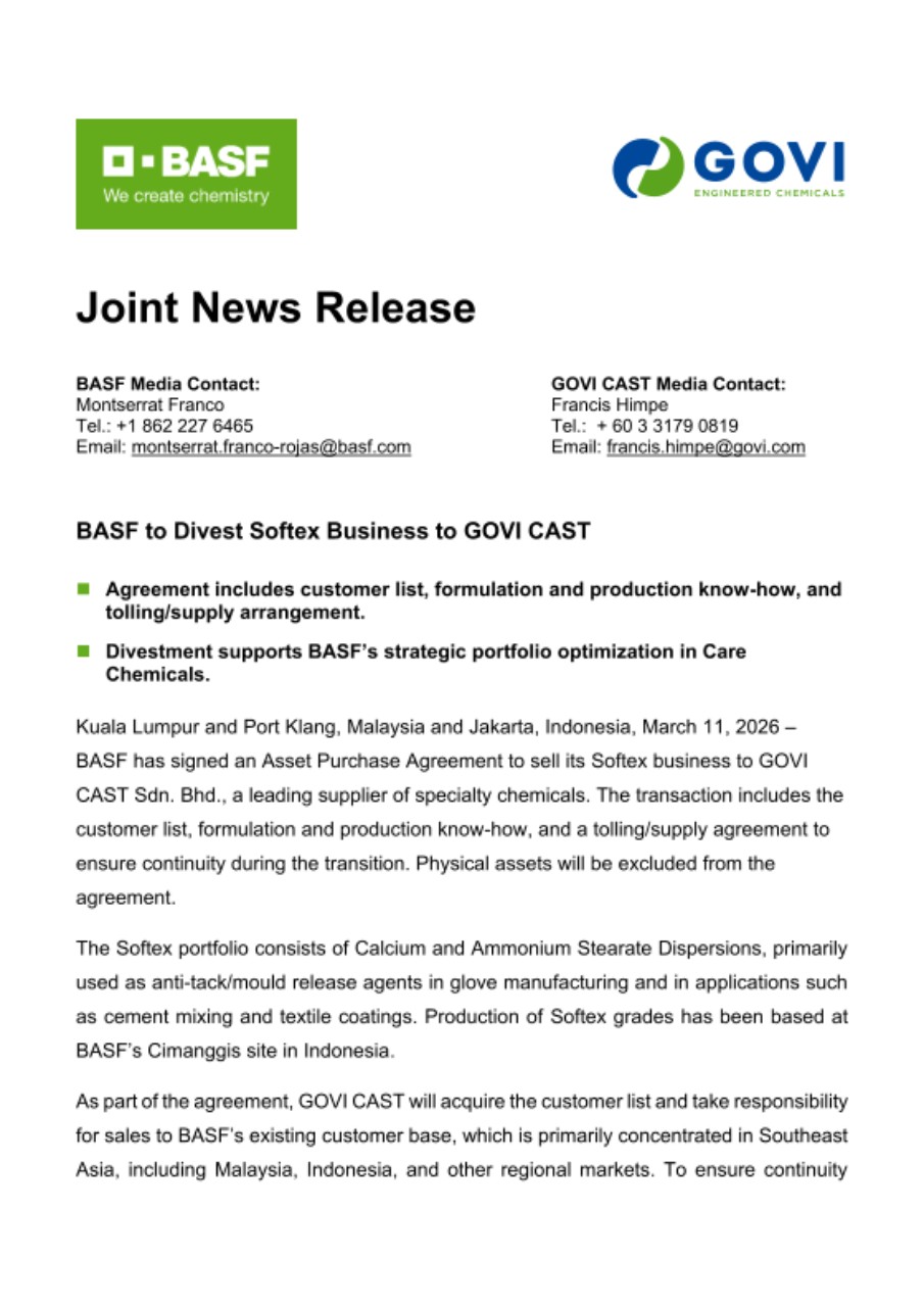 Kuala Lumpur and Port Klang, Malaysia and Jakarta, Indonesia, March 11, 2026 – BASF has signed an Asset Purchase Agreement to sell its Softex business to GOVI CAST Sdn. Bhd., a leading supplier of specialty chemicals. The transaction includes the customer list, formulation and production know-how, and a tolling/supply agreement to ensure continuity during the transition. Physical assets will be excluded from the agreement.