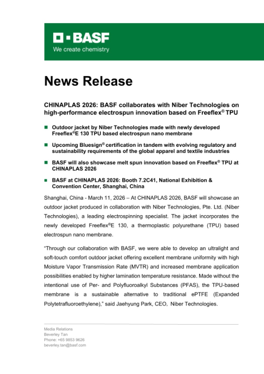 Shanghai, China - March 11, 2026 – At CHINAPLAS 2026, BASF will showcase an outdoor jacket produced in collaboration with Niber Technologies, Pte. Ltd. (Niber Technologies), a leading electrospinning specialist. The jacket incorporates the newly developed Freeflex®E 130, a thermoplastic polyurethane (TPU) based electrospun nano membrane.