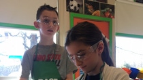 Using chromatography paper, paper clips, straws, beakers and four different markers, the fourth graders drew a line on a different strip of chromatography paper with each of the four markers. The permanent markers went into beakers with rubbing alcohol and the water-soluble ones were dipped into beakers with water. The liquid traveled up the paper and separated the black color into its components. The students then compared their results to the note to determine who stole the lunch.