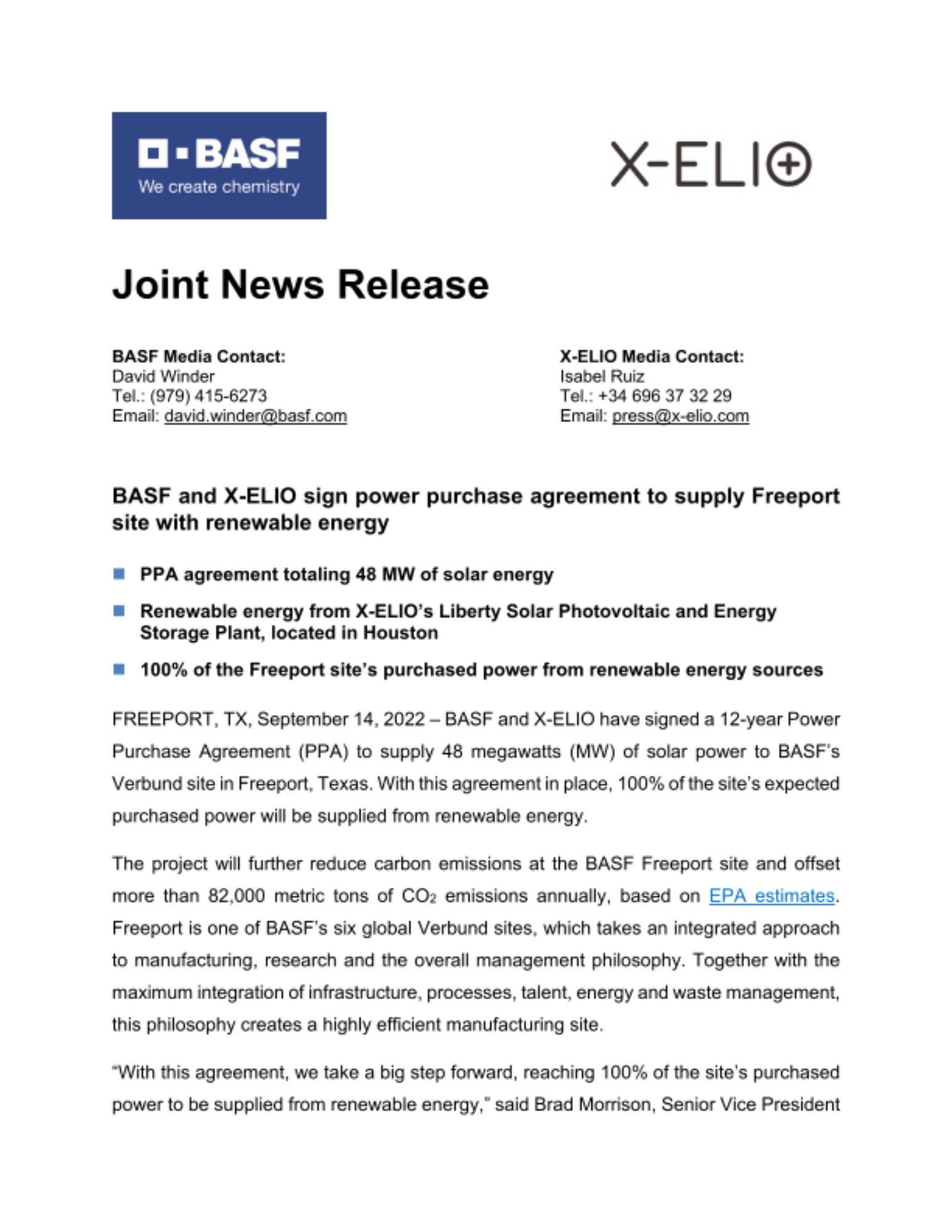 “With this agreement, we take a big step forward, reaching 100% of the site’s purchased power to be supplied from renewable energy,” said Brad Morrison, Senior Vice President and Site Manager for the BASF site in Freeport. “Securing renewable energy at our Freeport site is a necessary step to improving our energy footprint and we appreciate the partnership with X-ELIO, which helps us realize the company’s goal of net-zero emissions by 2050.”