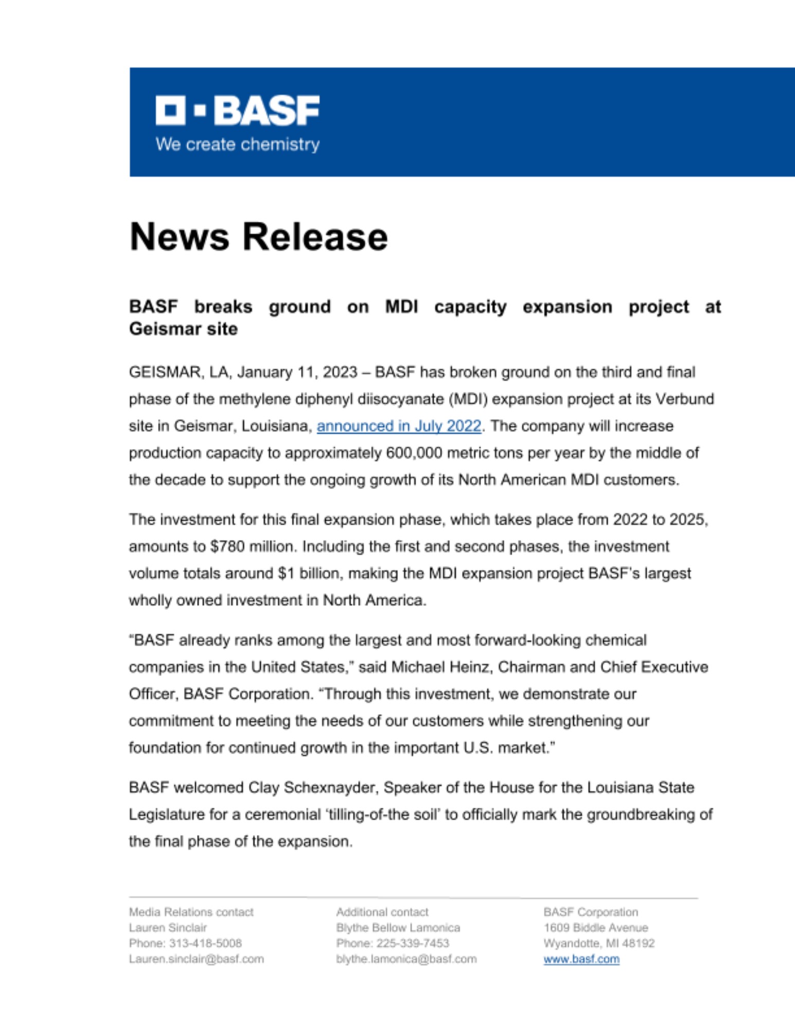 GEISMAR, LA, January 11, 2023 – BASF has broken ground on the third and final phase of the methylene diphenyl diisocyanate (MDI) expansion project at its Verbund site in Geismar, Louisiana, announced in July 2022. The company will increase production capacity to approximately 600,000 metric tons per year by the middle of the decade to support the ongoing growth of its North American MDI customers.