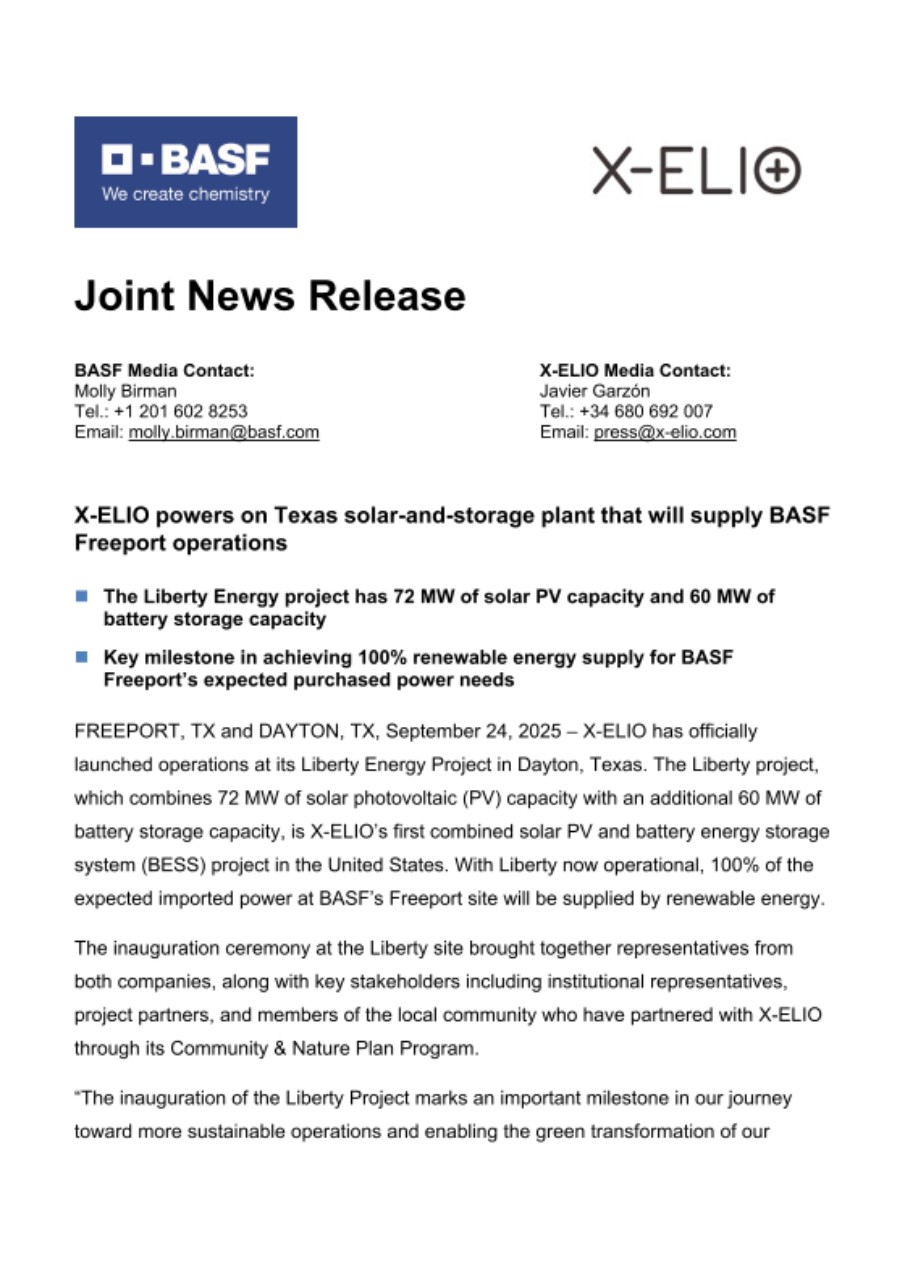 FREEPORT, TX and DAYTON, TX, September 24, 2025 – X-ELIO has officially launched operations at its Liberty Energy Project in Dayton, Texas. The Liberty project, which combines 72 MW of solar photovoltaic (PV) capacity with an additional 60 MW of battery storage capacity, is X-ELIO’s first combined solar PV and battery energy storage system (BESS) project in the United States. With Liberty now operational, 100% of the expected imported power at BASF’s Freeport site will be supplied by renewable energy.