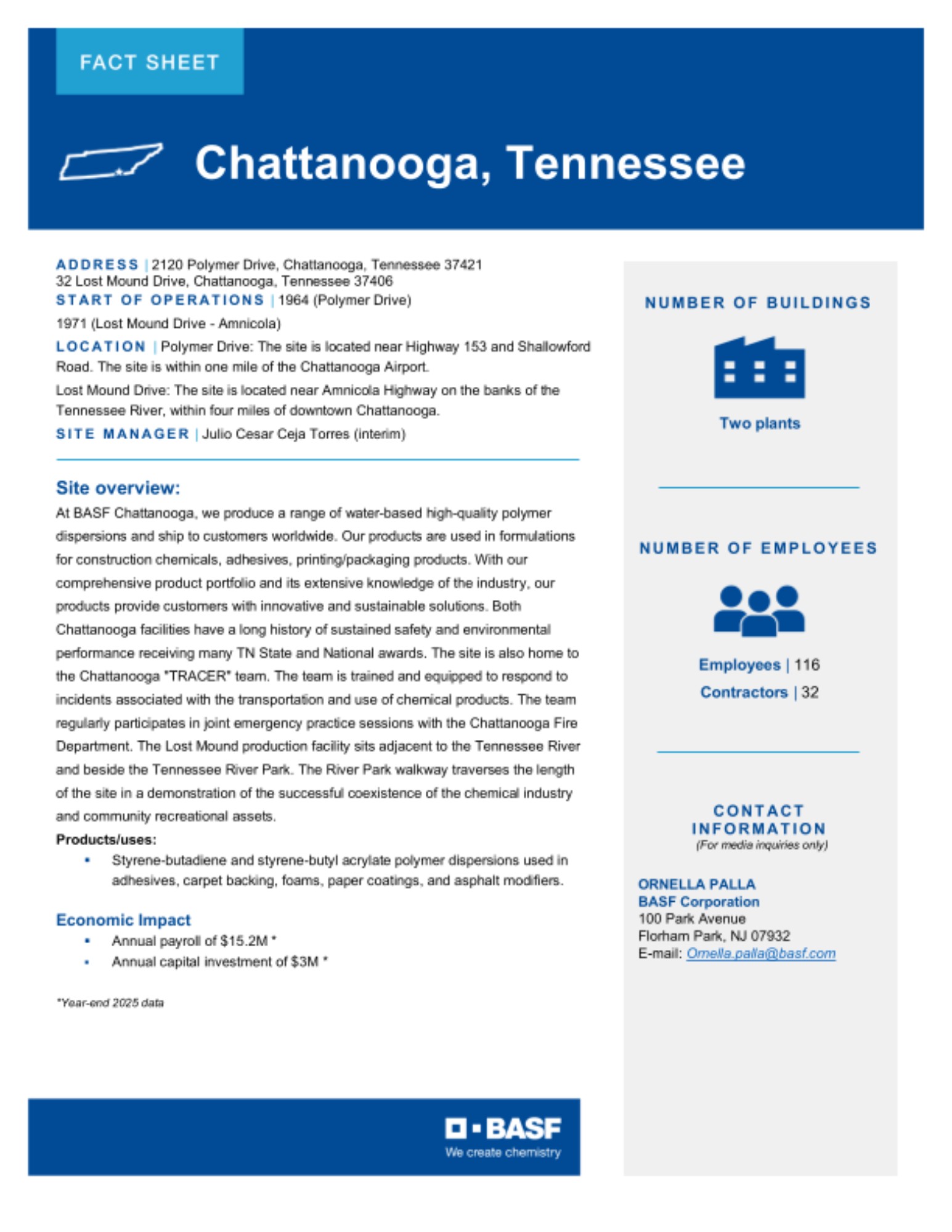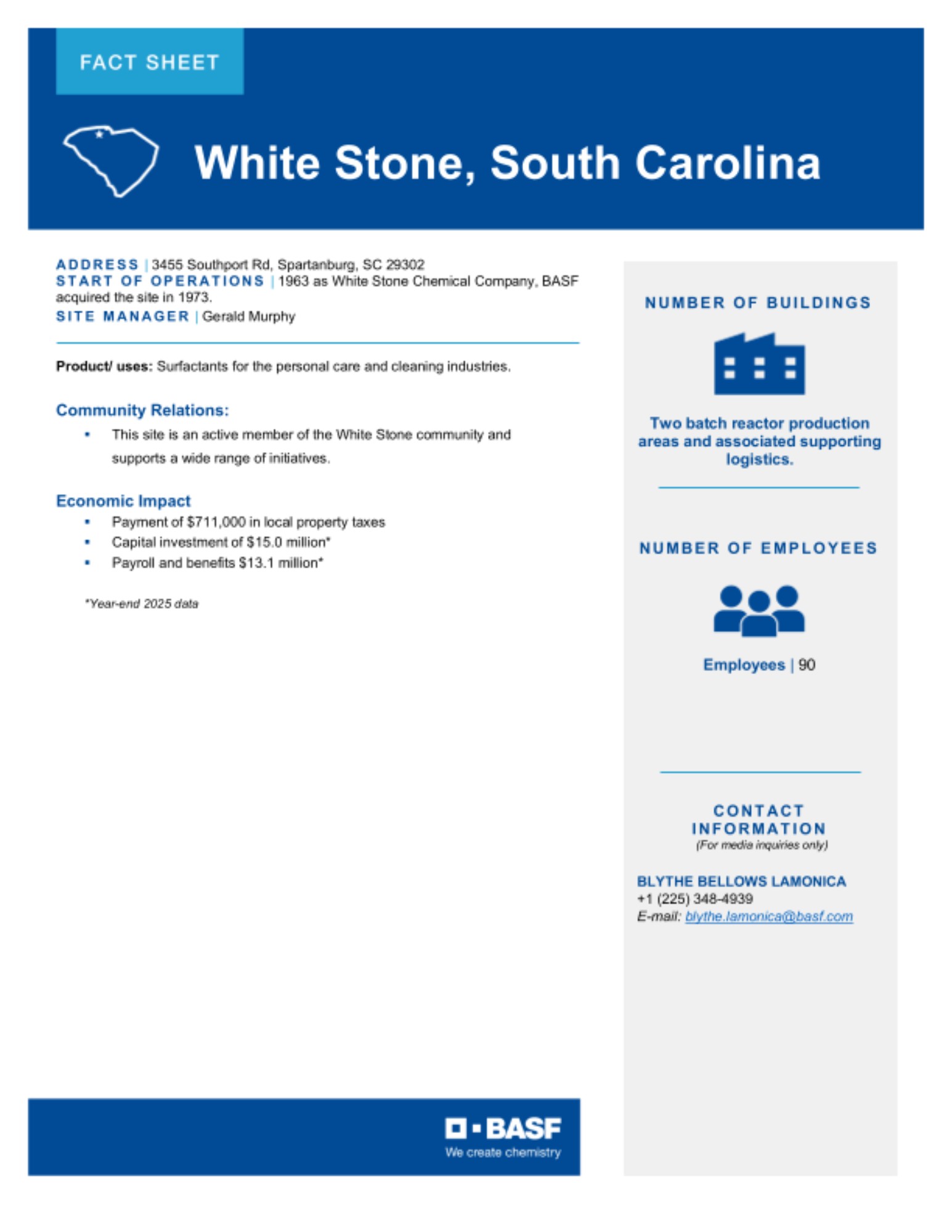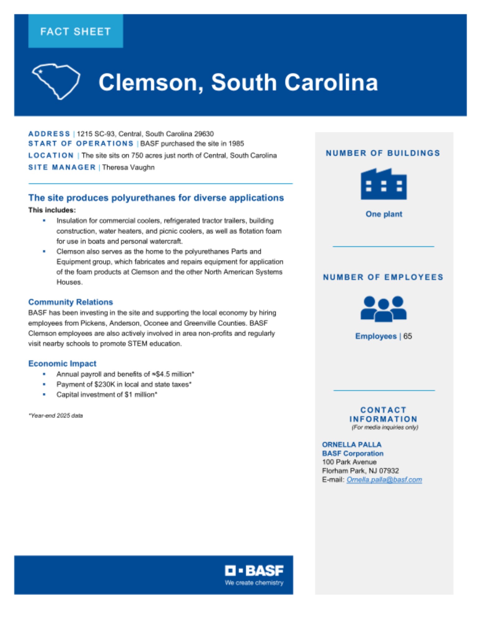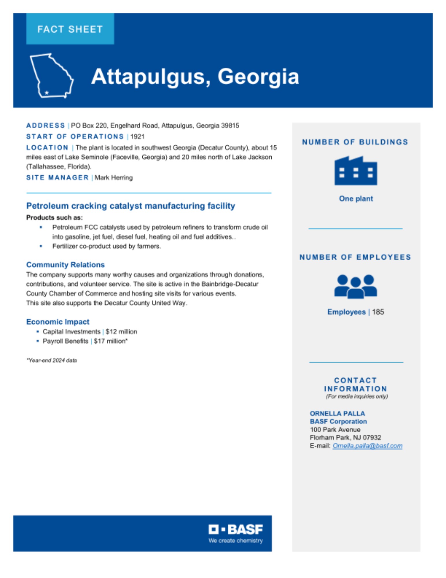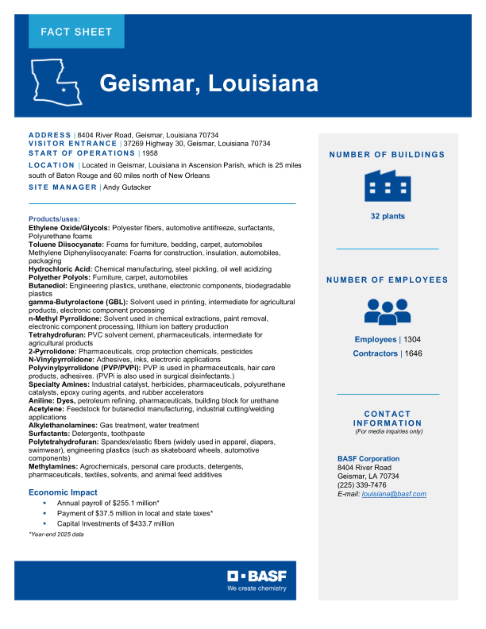 The Site Fact Sheets below provide overviews of BASF's key manufacturing sites in the U.S., including what is manufactured at each site and the site's local economic impact.