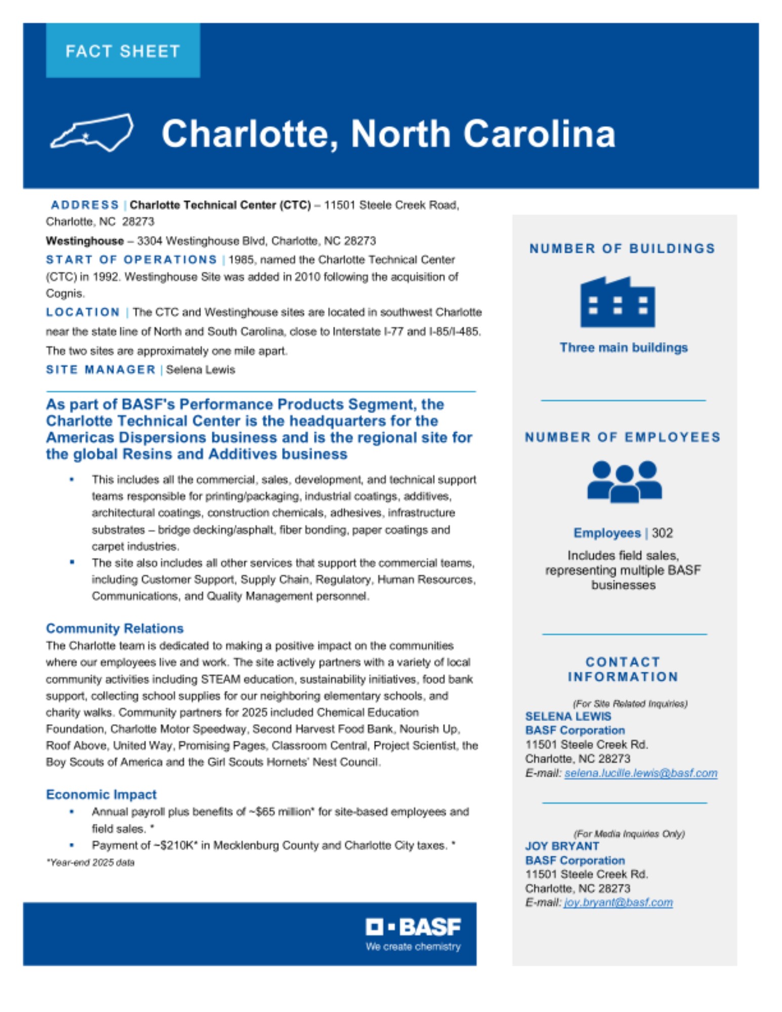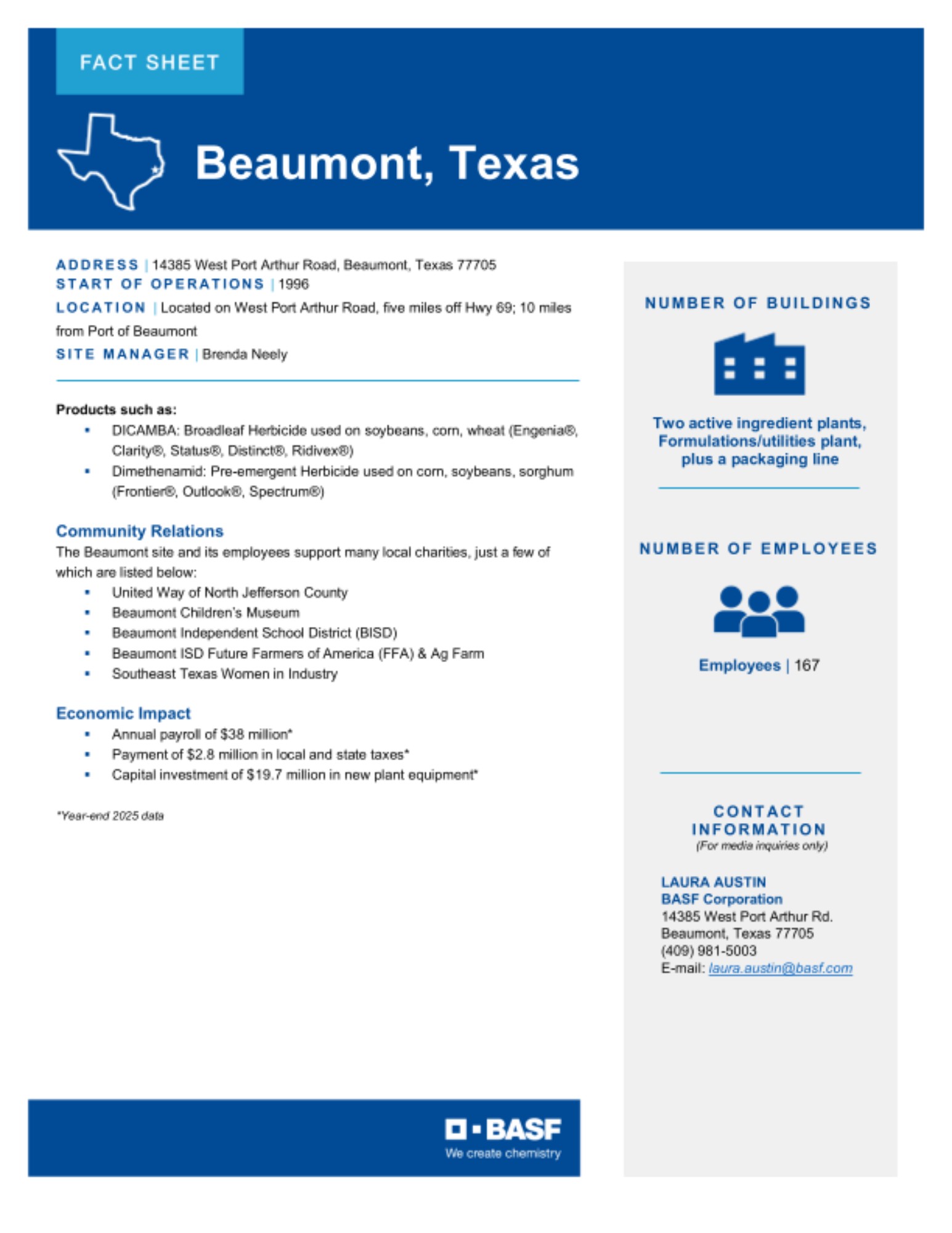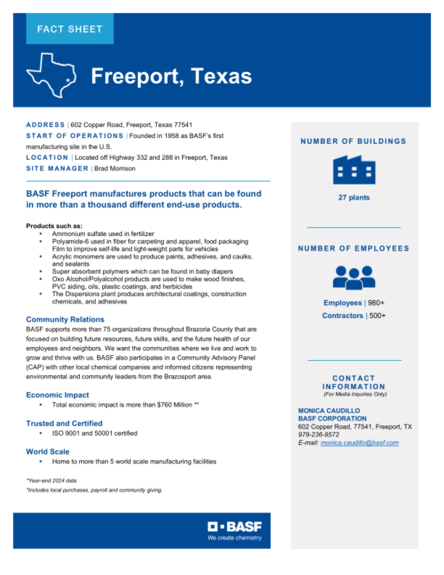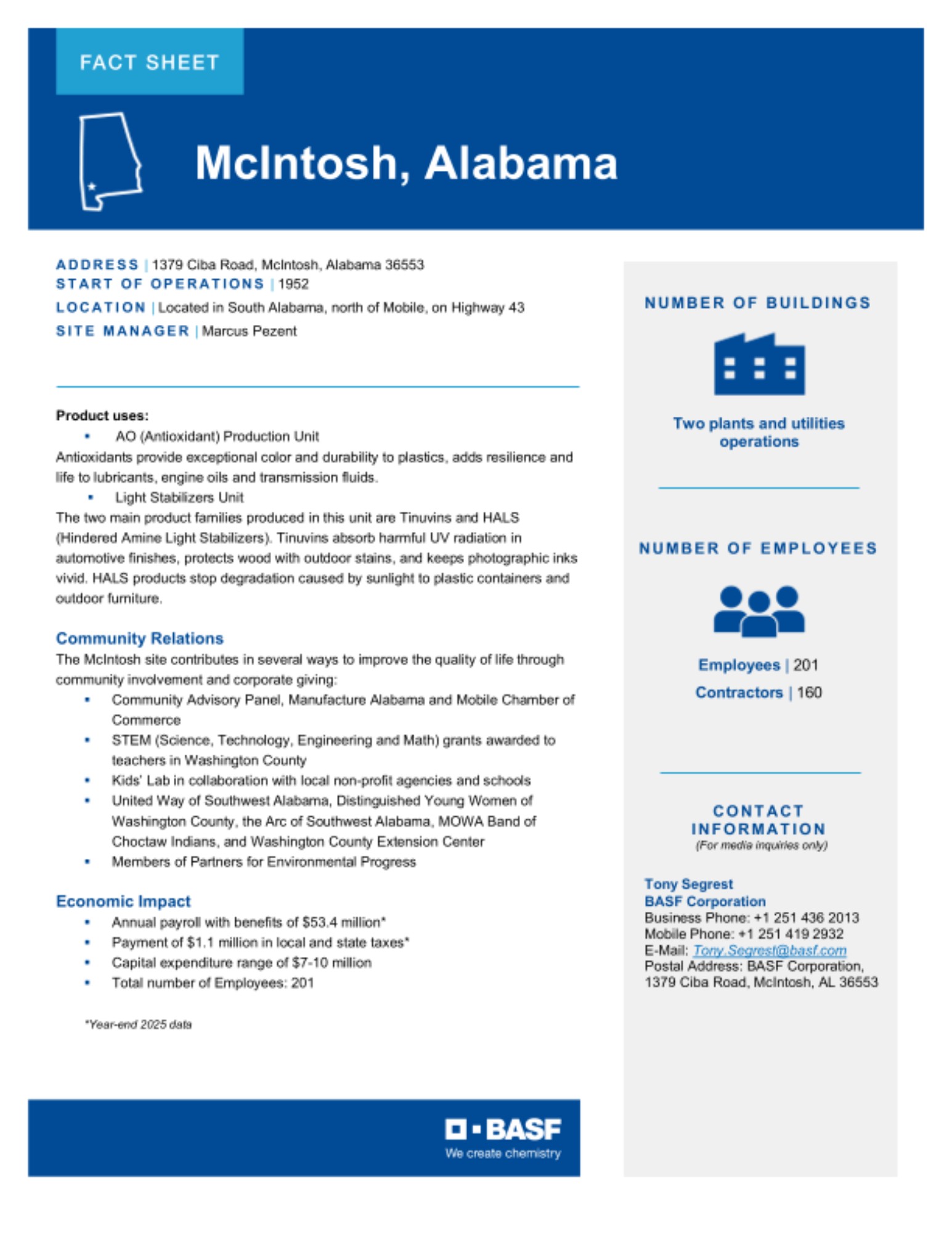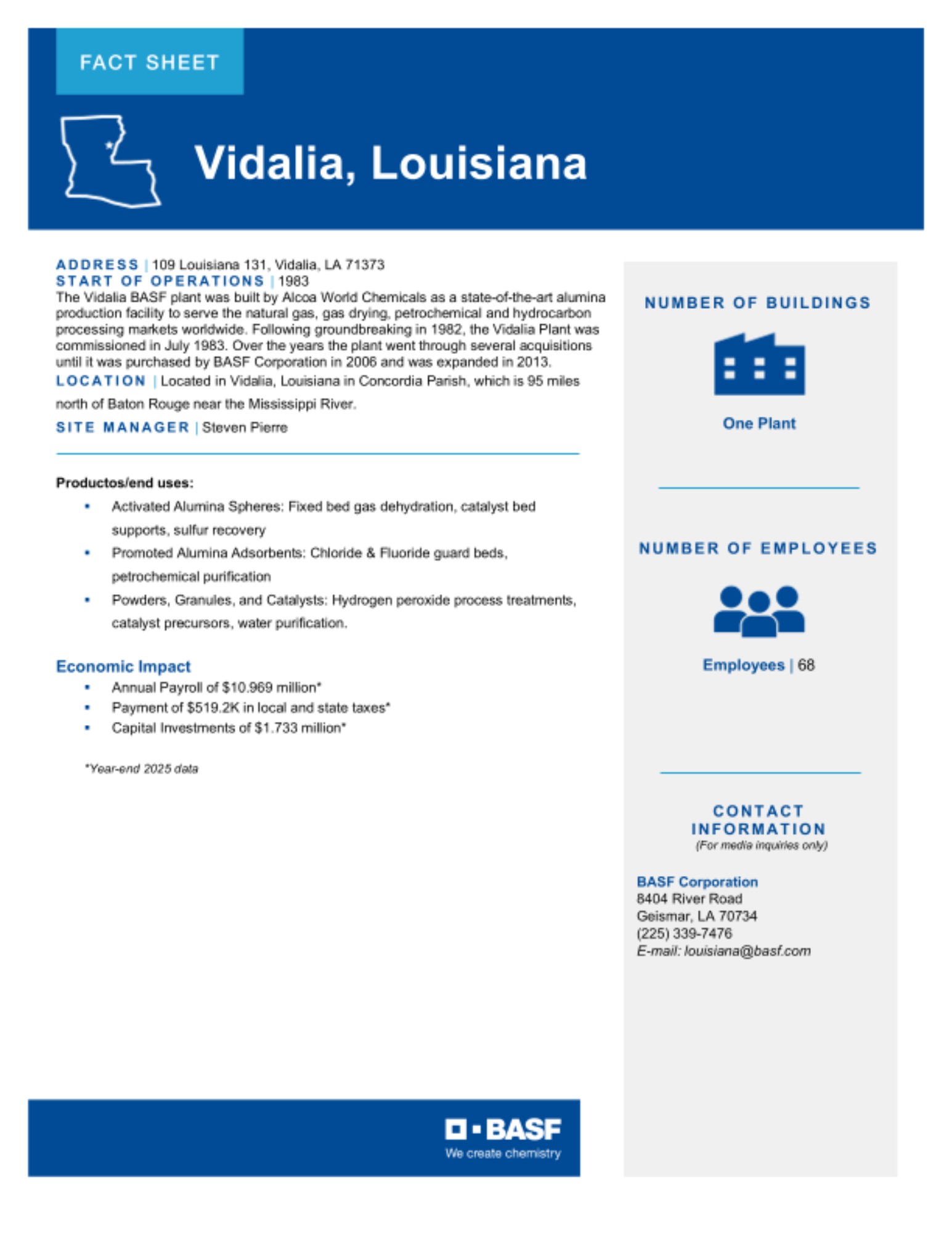 The Site Fact Sheets below provide overviews of BASF's key manufacturing sites in the U.S., including what is manufactured at each site and the site's local economic impact.