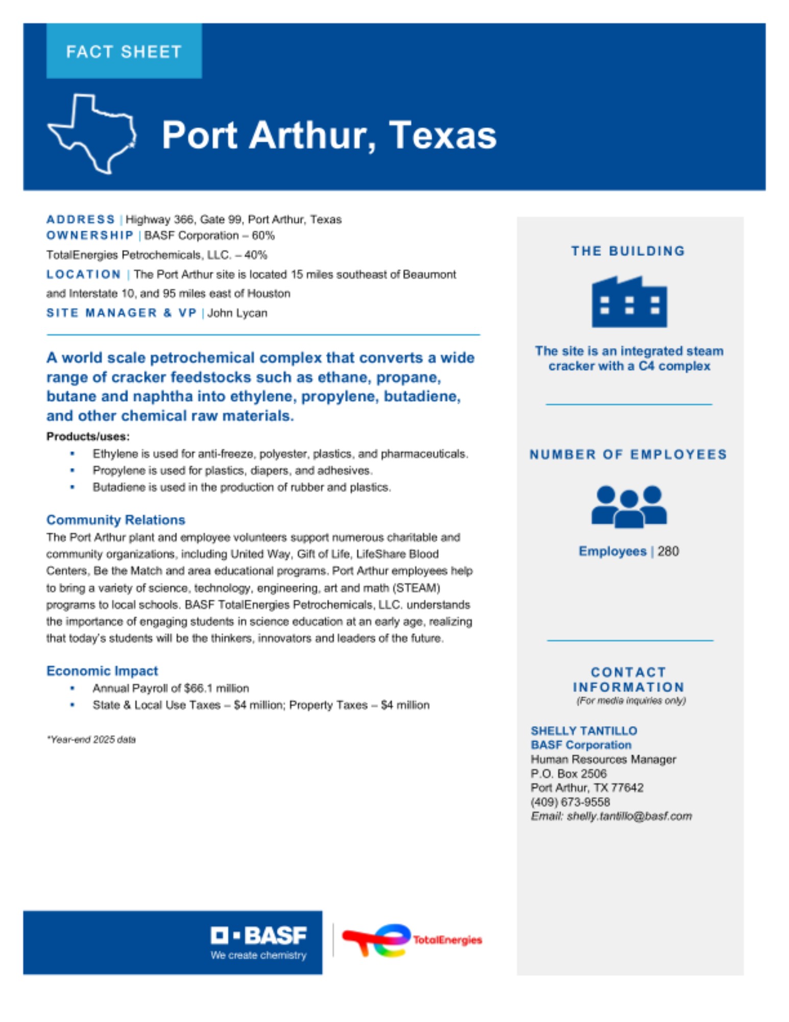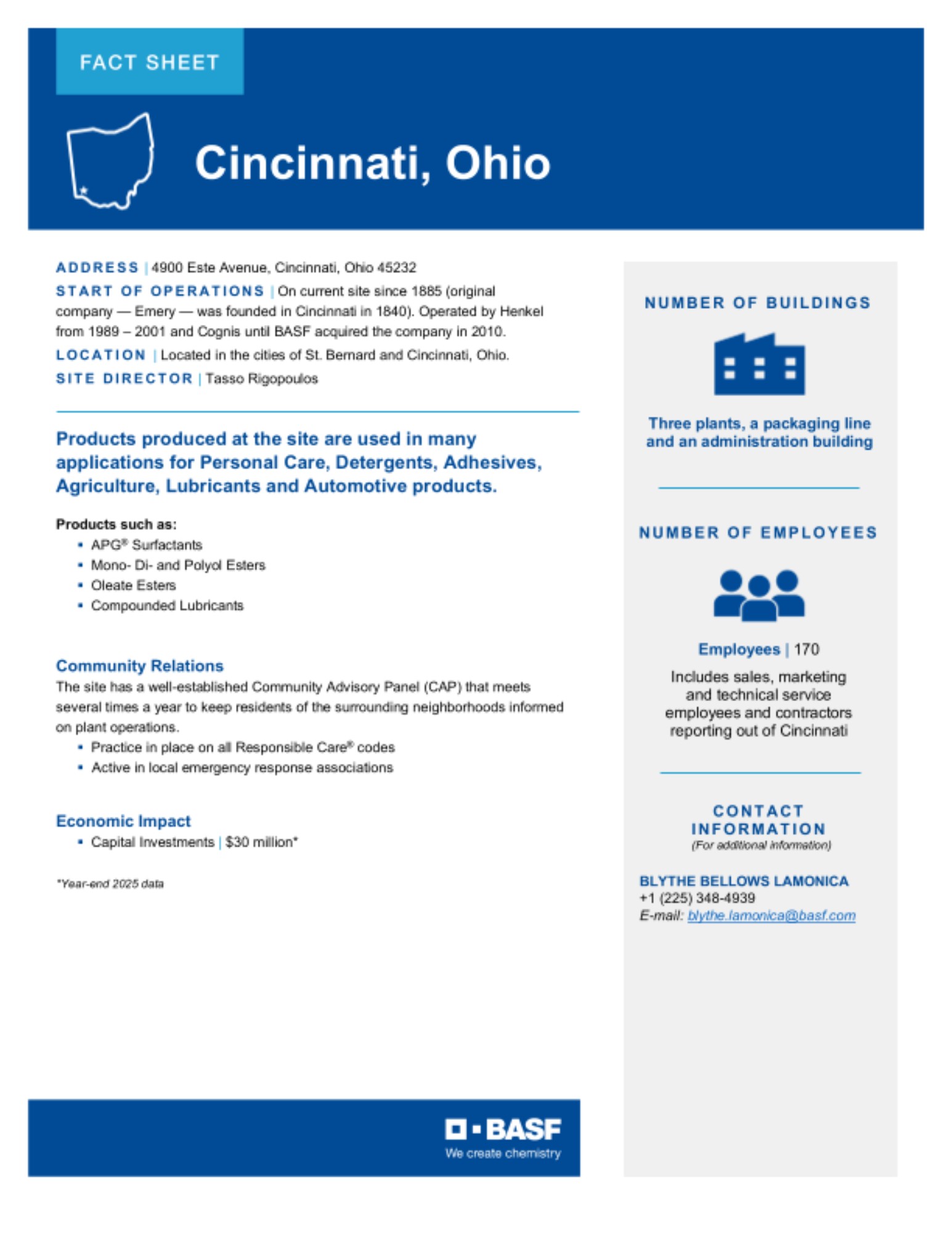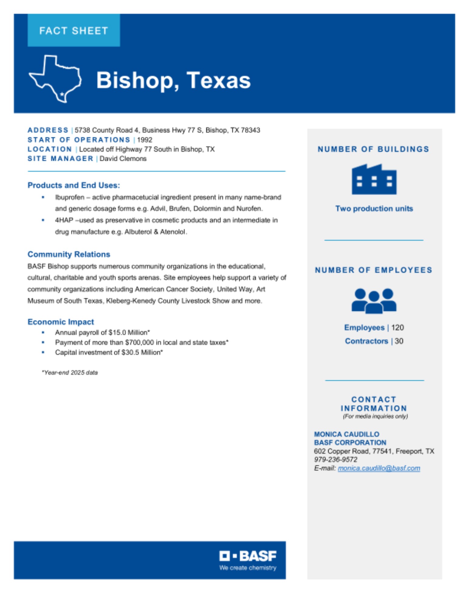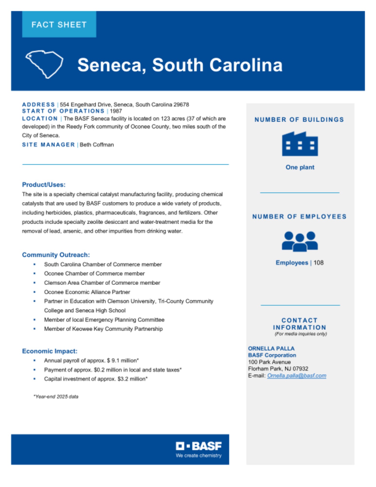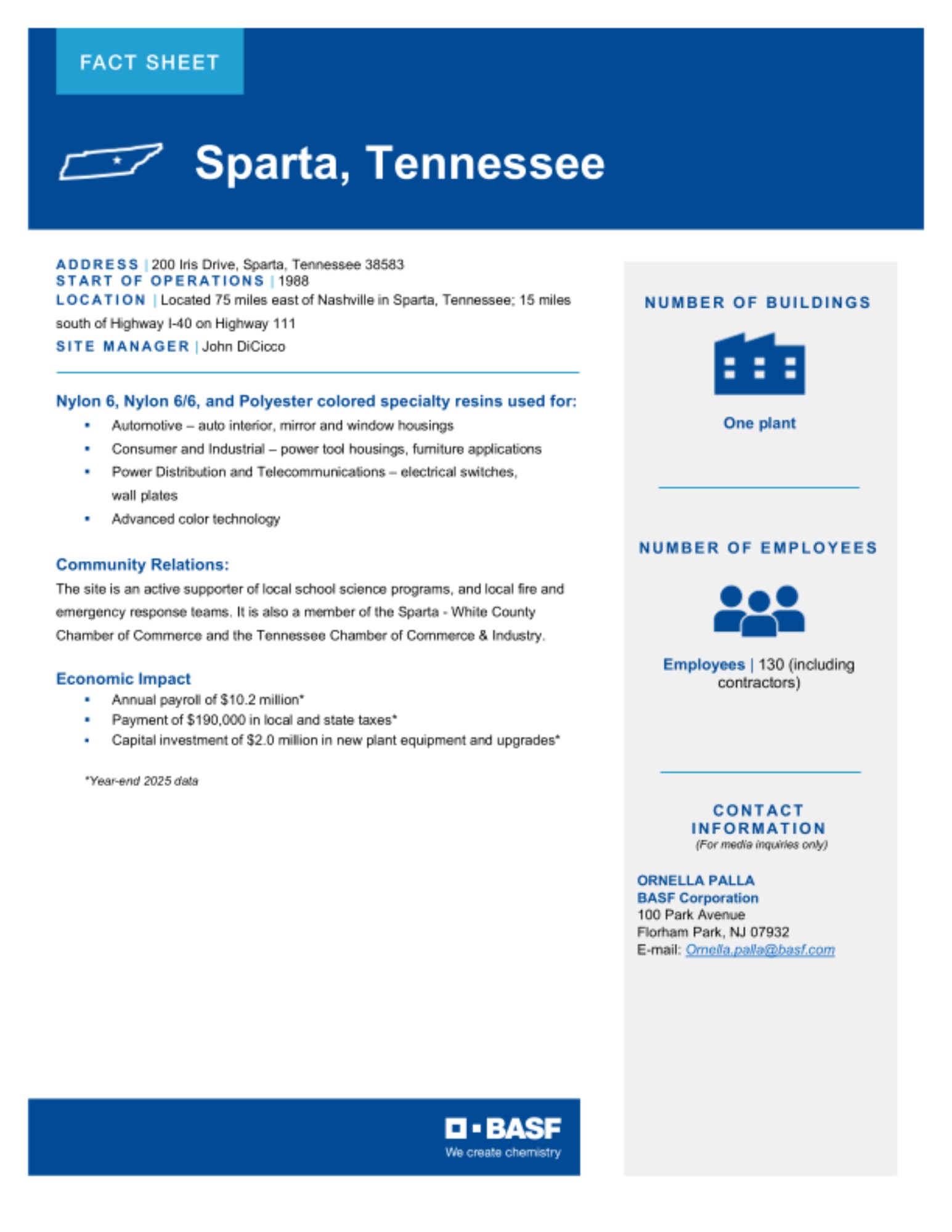 The Site Fact Sheets below provide overviews of BASF's key manufacturing sites in the U.S., including what is manufactured at each site and the site's local economic impact.