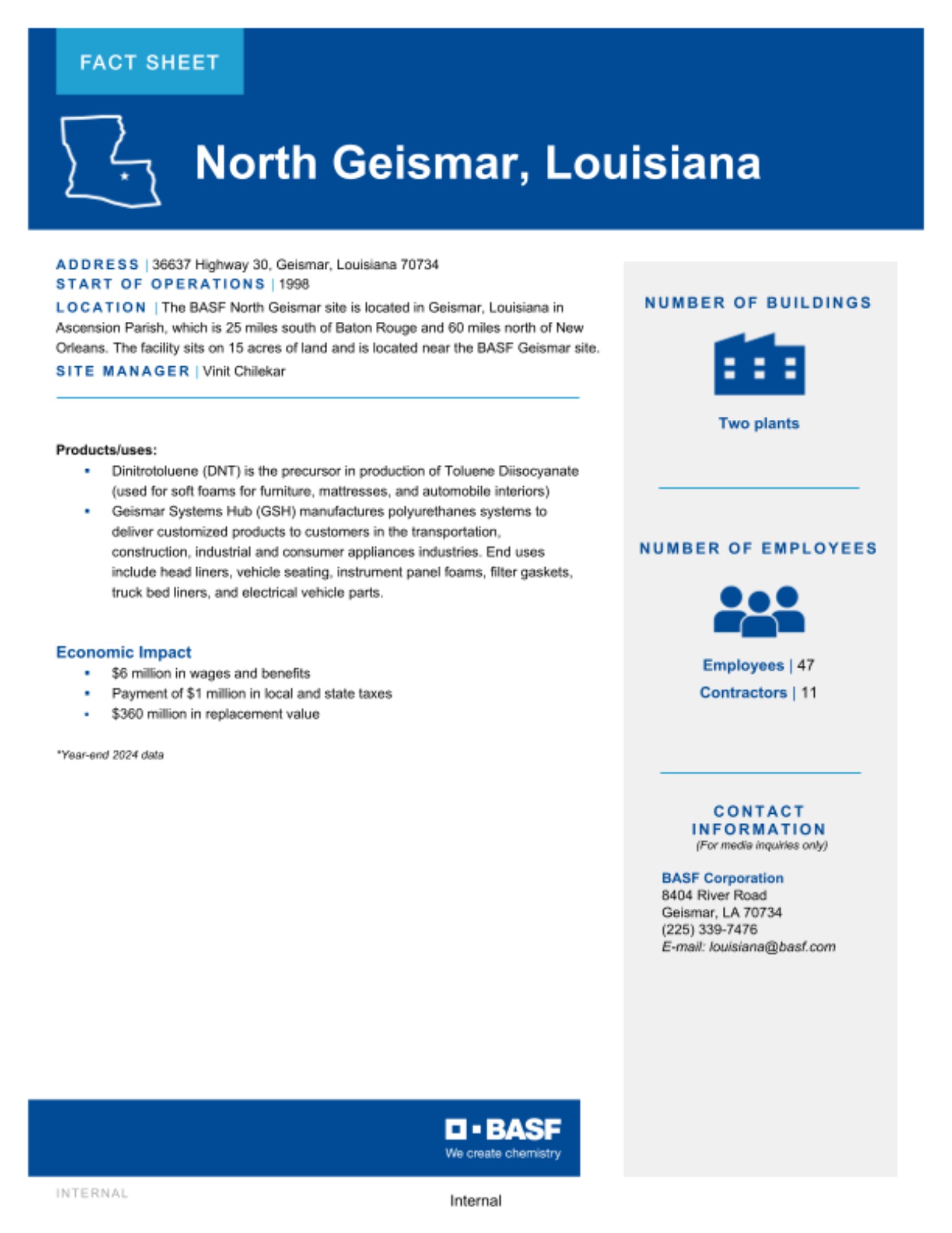 BASF’s manufacturing presence in Louisiana includes operations in Geismar, North Geismar, and Vidalia.